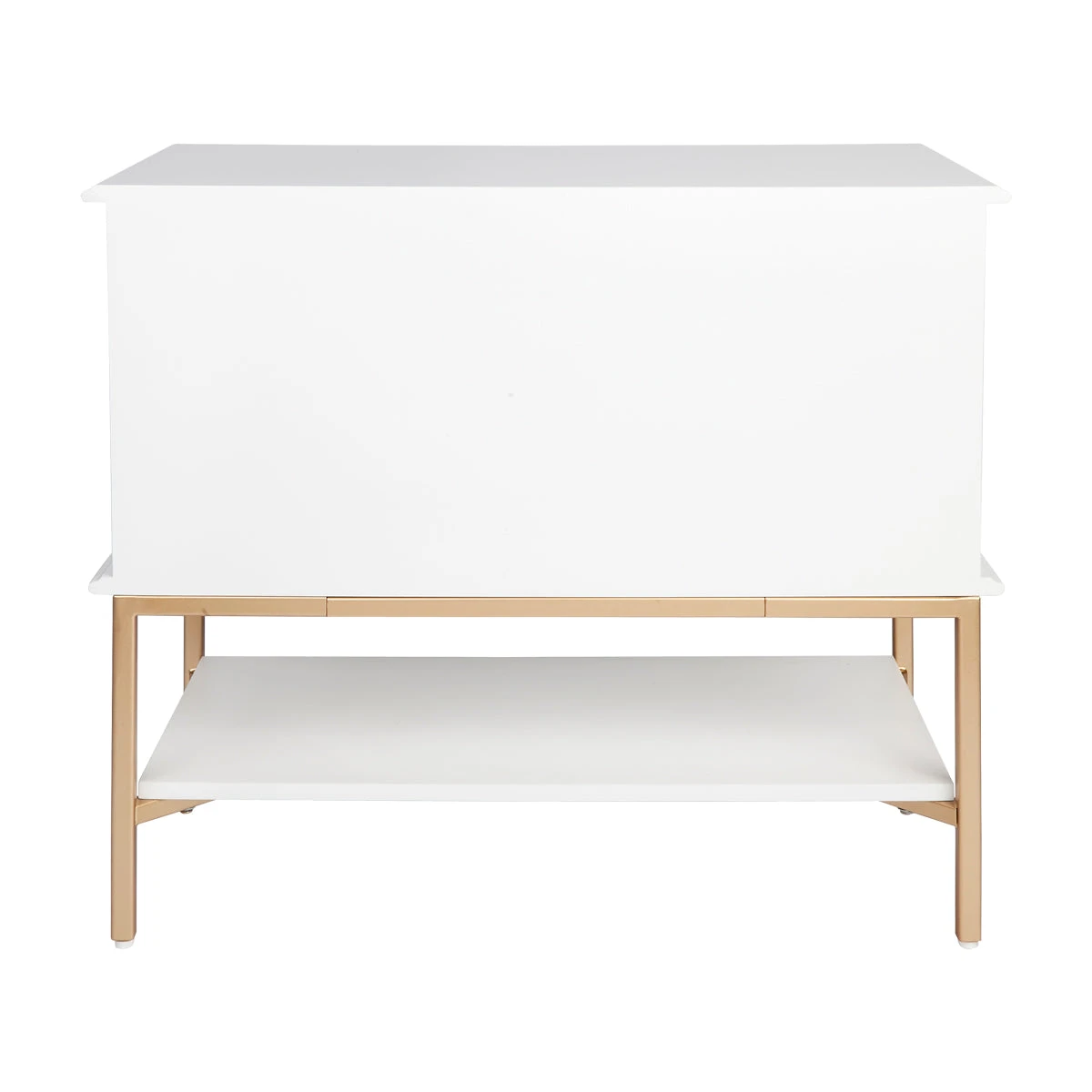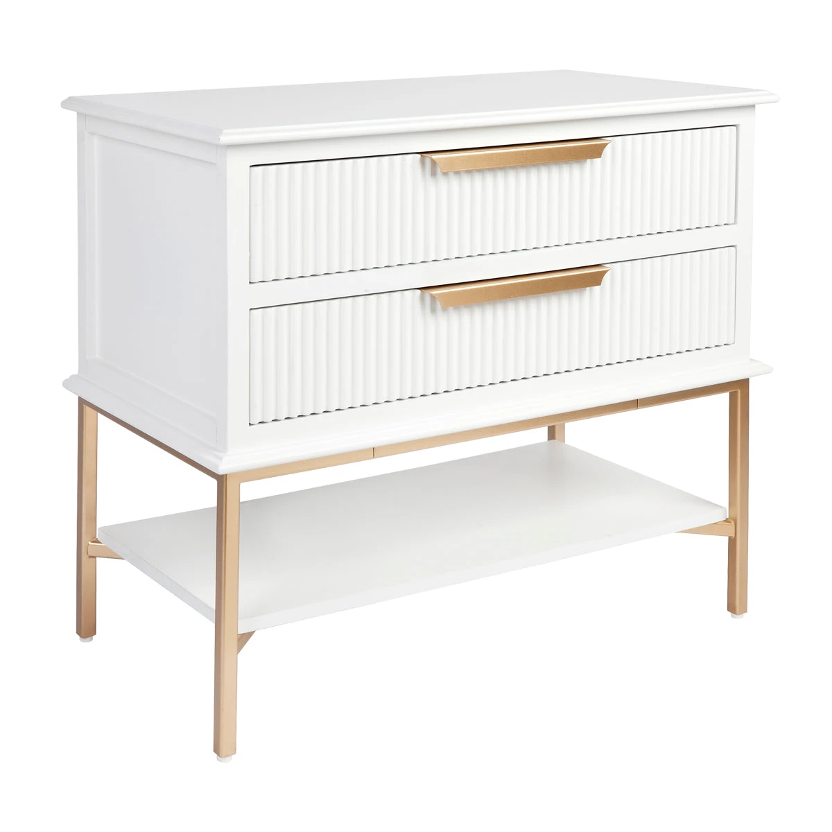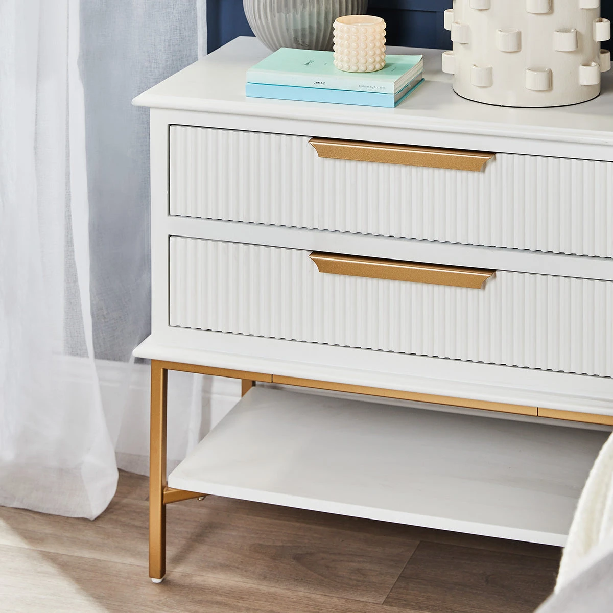 A classic design for the sophisticated home, the Aimee bedside table exudes a contemporary touch with clean, modular styling. The Aimee bedside table features two ribbed-front drawers plus a bonus shelf for extra storage and display, set atop a simple and elegant gold metal frame, offering a subtle hint of luxury. Drawing inspiration from interiors of chic Parisian homes in a colour palette that lends refined modern edge to classic forms.