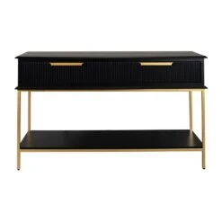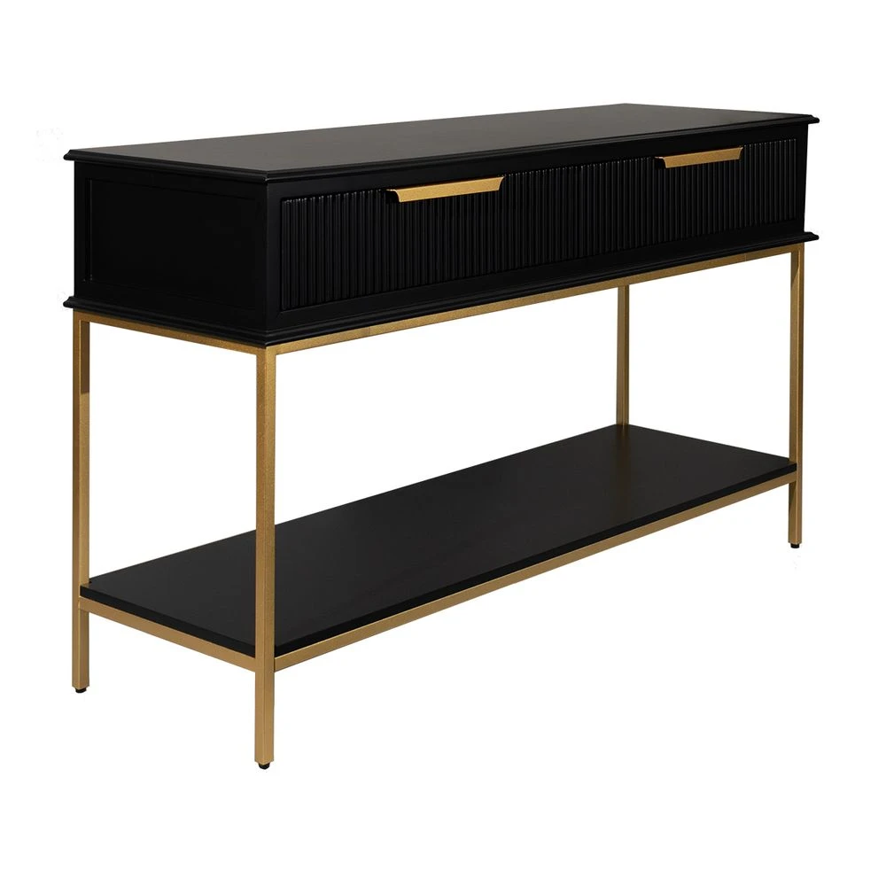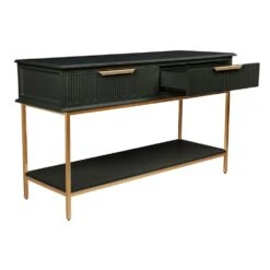 Classic contemporary in design, the small Aimee console table in black features fluted drawer fronts and an elegant streamline profile in a chic satin painted finish with contemporary gold metal hardware and iron frame. Also available in a 2m length 3 drawer option, the Aimee range has been designed to slip seamlessly into both classic and modern interiors offering practical and sophisticated solutions for entry, hallway or living room spaces. Also available in white.