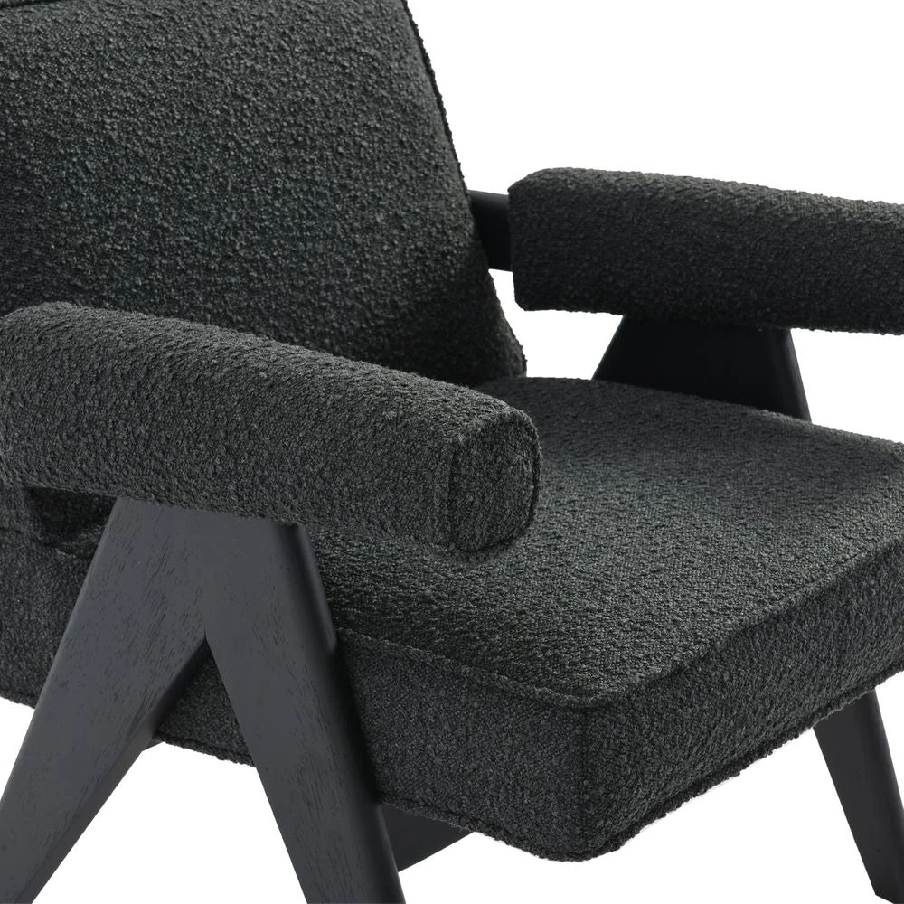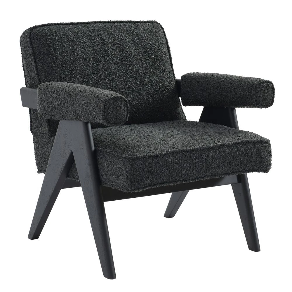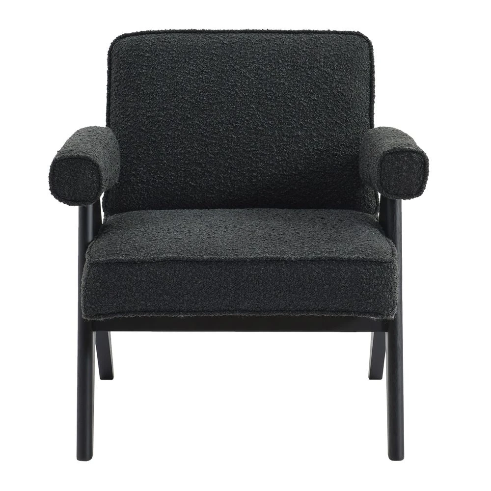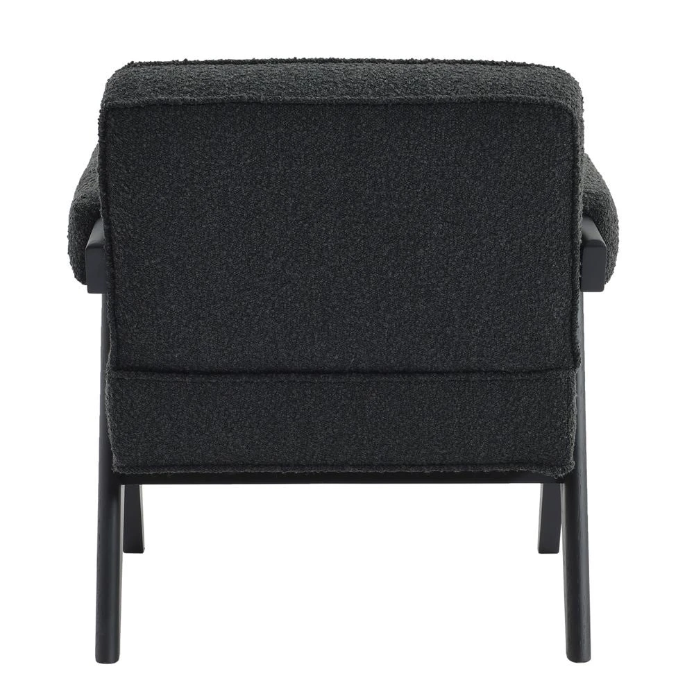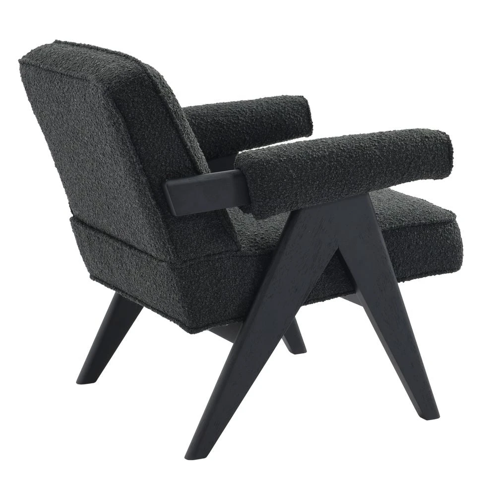 Embrace timeless elegance and sophistication with the Ambrose Arm Chair. A versatile occasional arm chair that seamlessly fuses contemporary appeal with a Mid Century design. Upholstered seat, arms and back cushions available in high-wearing black boucle add comfort and style to any modern classic interior. Tapered wood veneer legs, hand-painted in a sleek black finish, ground this distinguished design. Also available in durable white boucle and plush ochre velvet.