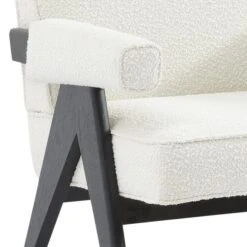Embrace timeless elegance and sophistication with the Ambrose Arm Chair. A versatile occasional arm chair that seamlessly fuses contemporary appeal with a Mid Century design. Upholstered seat, arms and back cushions available in high-wearing white boucle add comfort and style to any modern classic interior. Tapered wood veneer legs, hand-painted in a sleek black finish, ground this distinguished design. Also available in durable black boucle and plush ochre velvet.