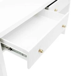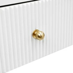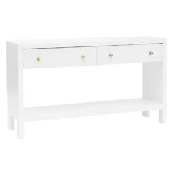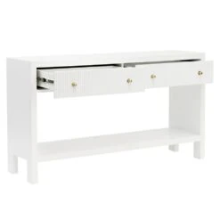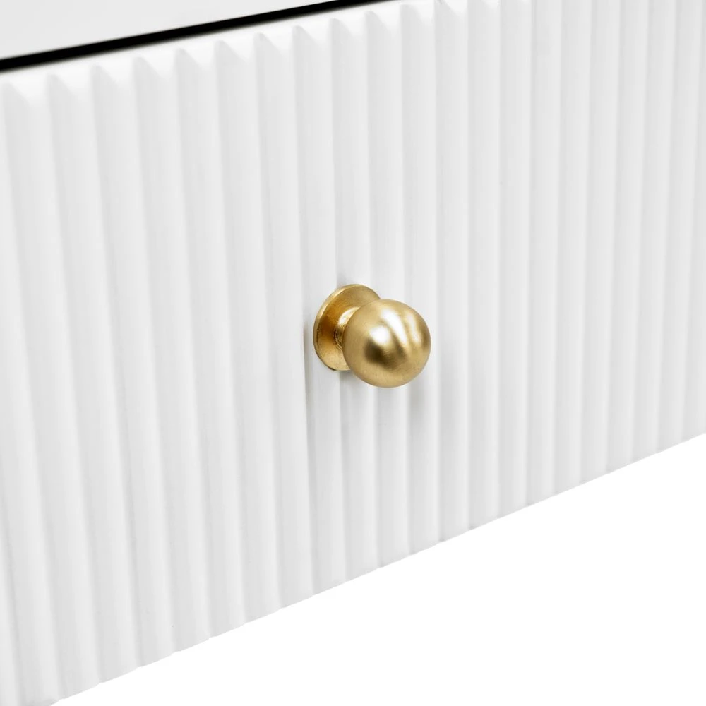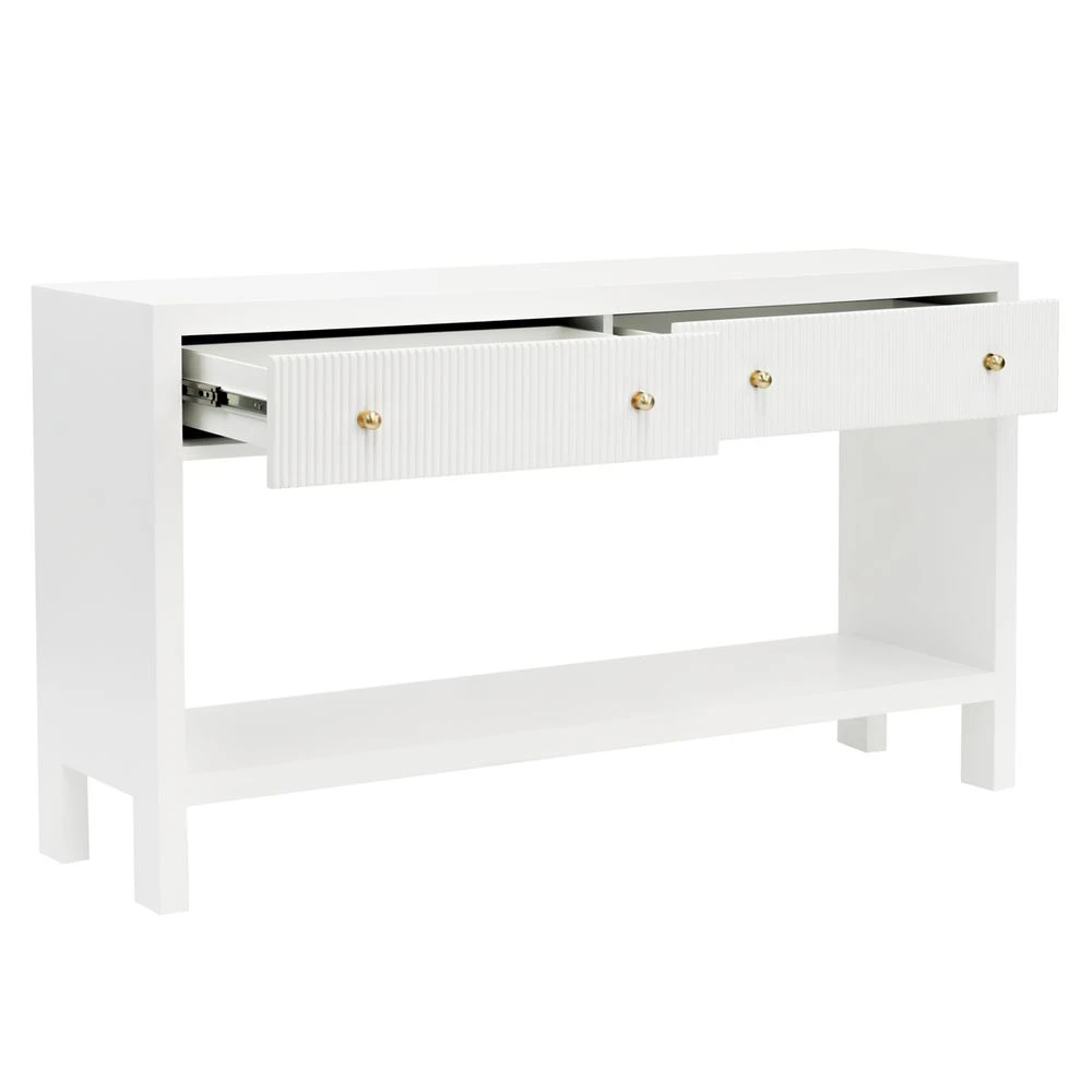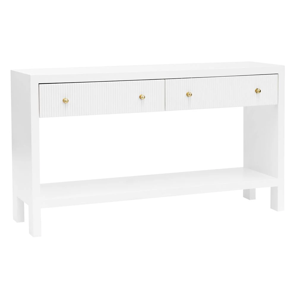 Embracing clean, modern aesthetics, the Ariana console table, in a fresh satin white painted finish, features elegant fluted drawer fronts punctuated by gorgeous brushed gold sphere handles. Adding an air of uncomplicated style to interiors, the Ariana console table embraces both function and beauty with two deep drawers and a lower shelf across its handsome proportions. An ideal addition to an entry, hallway or living room area, the solid structure, textural detailing and chic design of the Ariana console table elevates the visual appeal of the spaces it inhabits and allows it to work seamlessly across a variety of interior design styles.