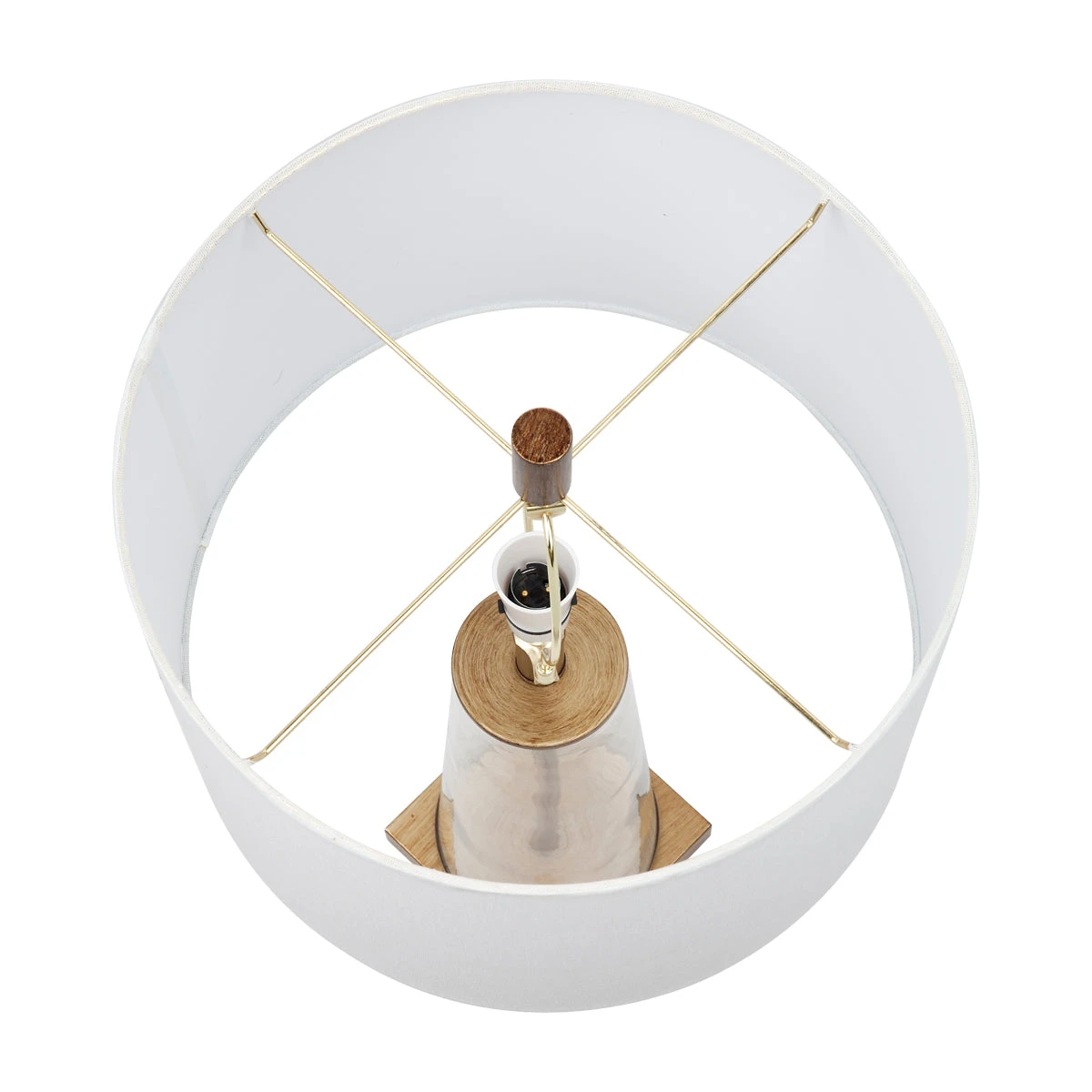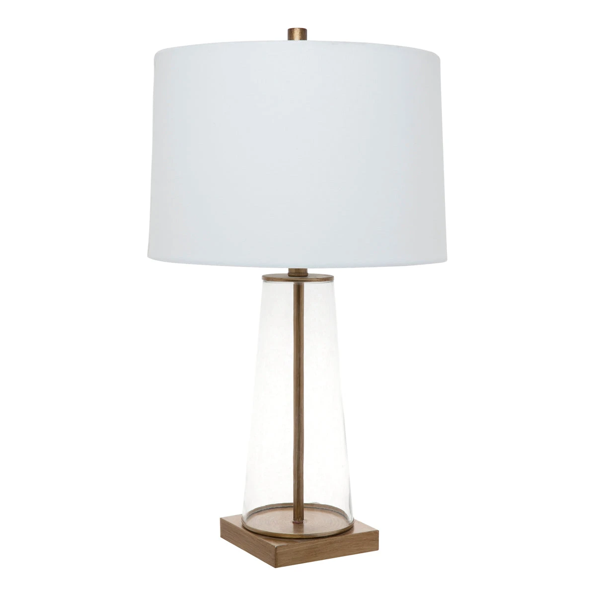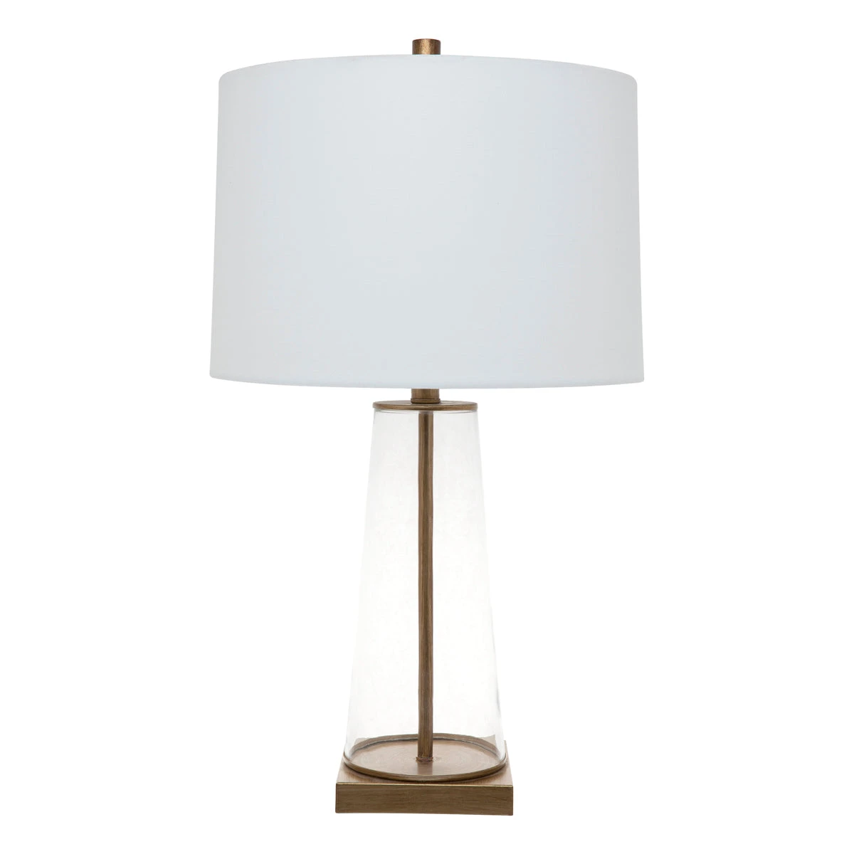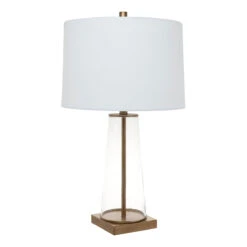 With a body made of a clear glass, the Aspen Table Lamp draws inspiration from the works of traditional artisan designers. The lamp`s transparency is accented by a painted antique gold rod through the glass and matching plinth. It is topped with an off white tapered linen shade.