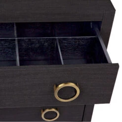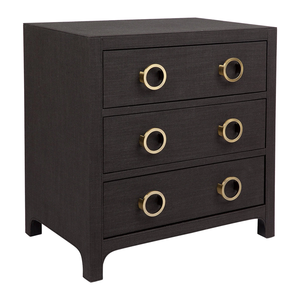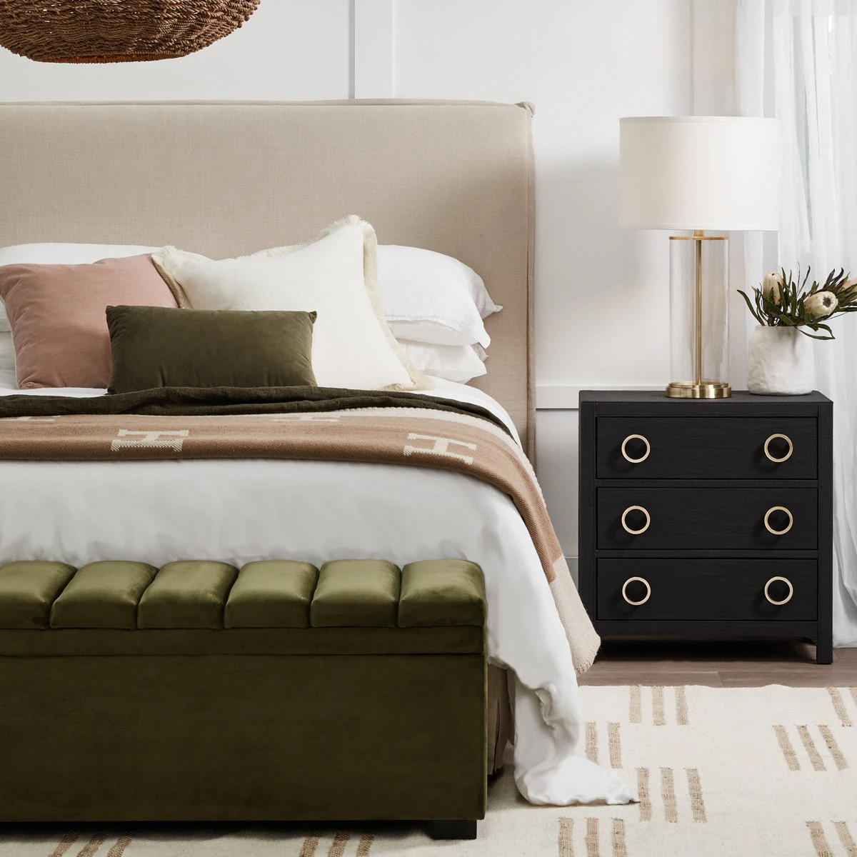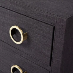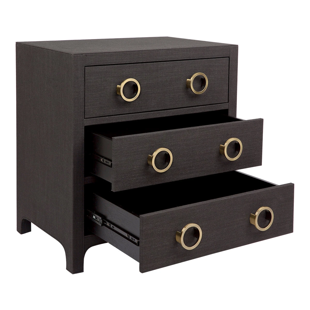 With a sharp, streamlined shape, the Astley bedside table brings both function and form to your bedroom. Uniquely wrapped in a rich black linen blended fabric with contrasting brass handles, watch as this bedside table transforms your space with its subtle, unique texture. Scaled for both maximum storage and design presents, the Astley bedside table is the epitome of function and beauty.