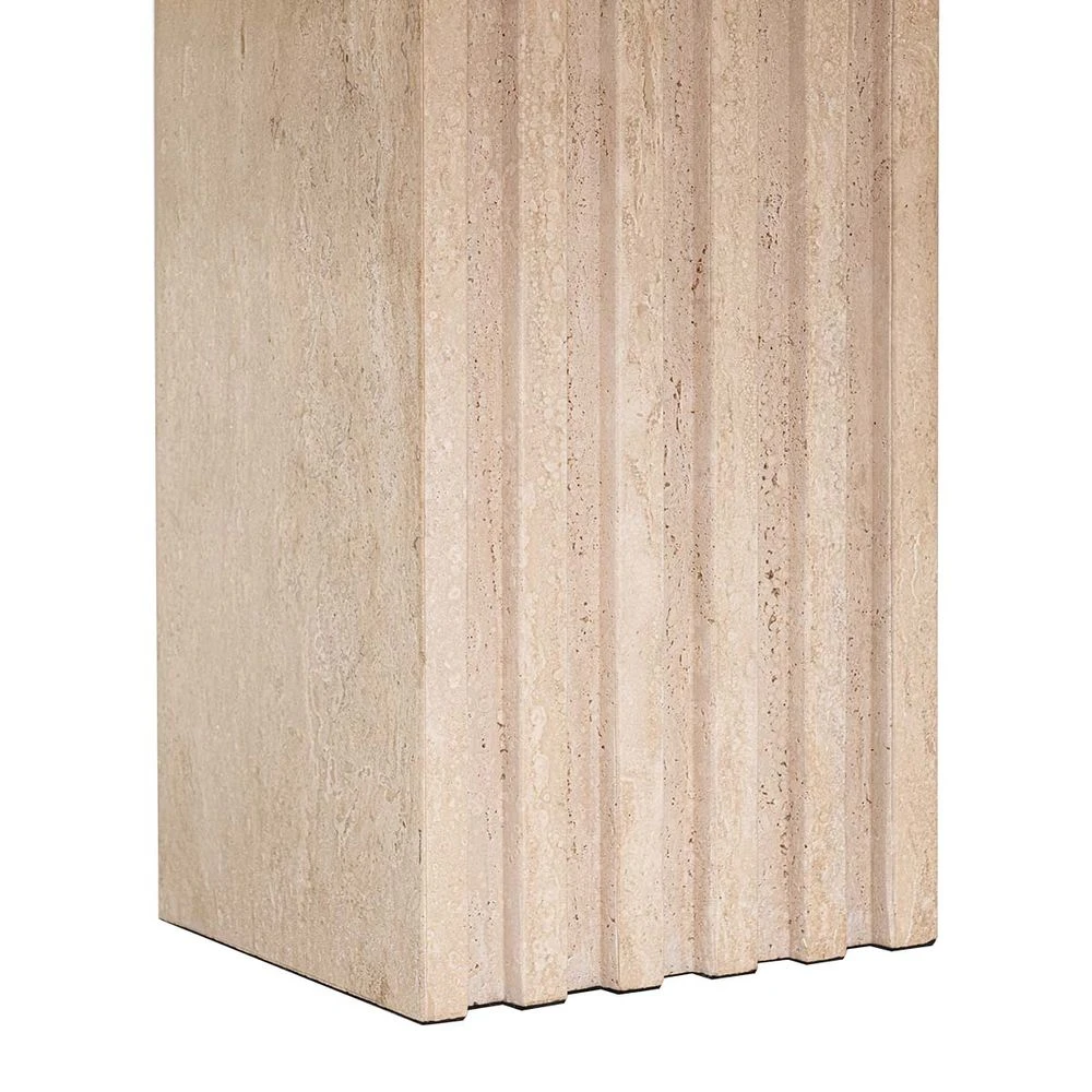 Crafted from natural travertine stone, the Atlas travertine coffee table range is undeniably striking. Uniting the tactile qualities of travertines warm tonal hues, distinctive veining and textural variations with bold architectural form, Atlas infuses both contemporary and classic interiors with alluring sculptural style. Available in three sizes at varying heights, Atlas medium, at 40cm height, is meticulously handcrafted with a 53cm square honed top and contoured pedestal base celebrating the stones natural beauty. Stunning as single side tables, or as a coffee table cluster, the Atlas range of tables are truly timeless and have been sealed with a matte polish for added protection.