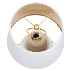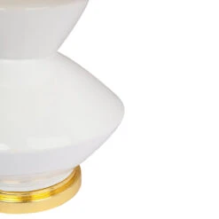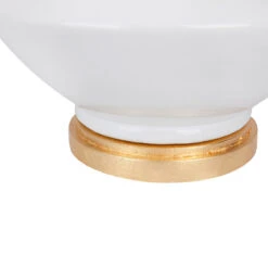 The Baldwin has a design which is simple yet structural. A white glaze finish cascades down the ceramic and plays on the angular design of the form. Topped with an white linen tapered shade with gold lining and is accented with a gold leaf base.