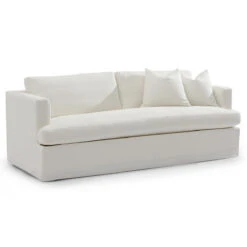 White linen 3 seater slip cover sofa. Comfortable soft seating and back with feather and foam fill. Solid hardwood frame with inner spring suspension. Slip cover with tailored sides are easy to remove for cleaning Professional dry cleaning services recommended. Do not tumble dry.