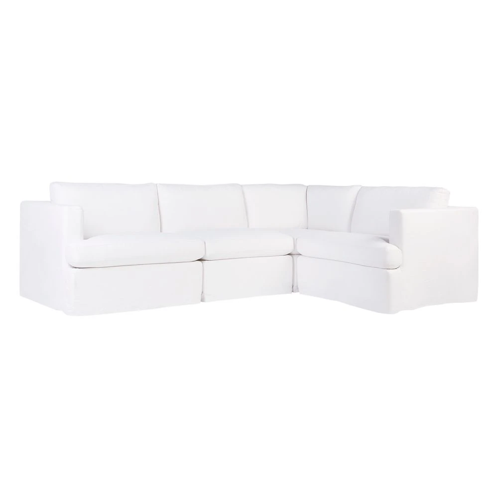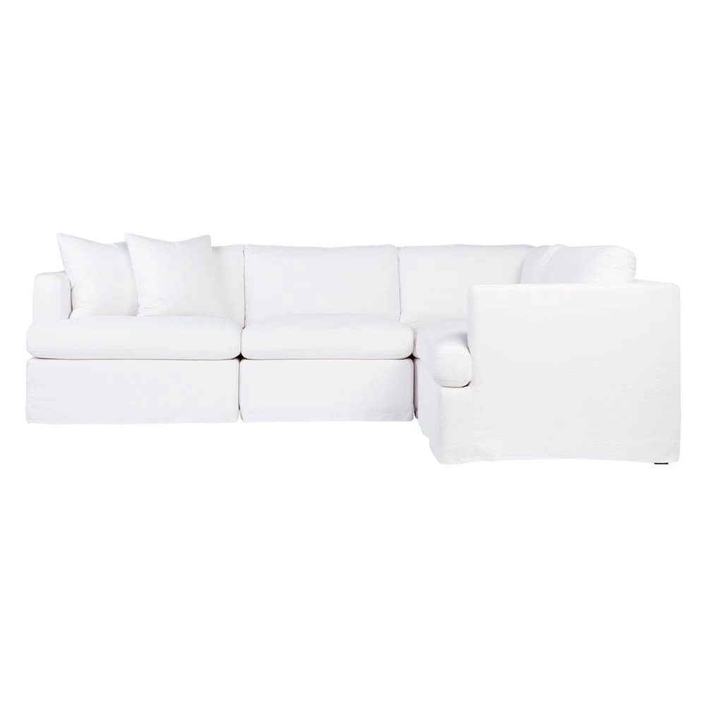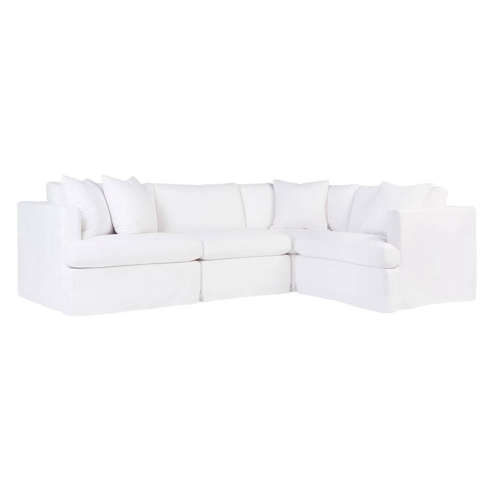 White linen slip cover modular sofa. Comfortable soft seating & back with feather & foam fill. Solid hardwood frame with inner spring suspension. Suits most décor from Hamptons, coastal and contemporary living. Slip cover with tailored sides are easily removed for cleaning. Includes a matching scatter cushion. Create your own style modular by adding pieces of the Birkshire range. Includes one matching scatter cushion.