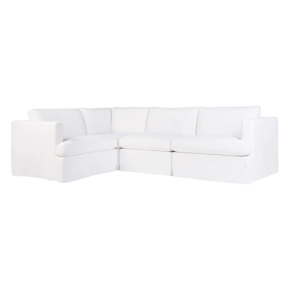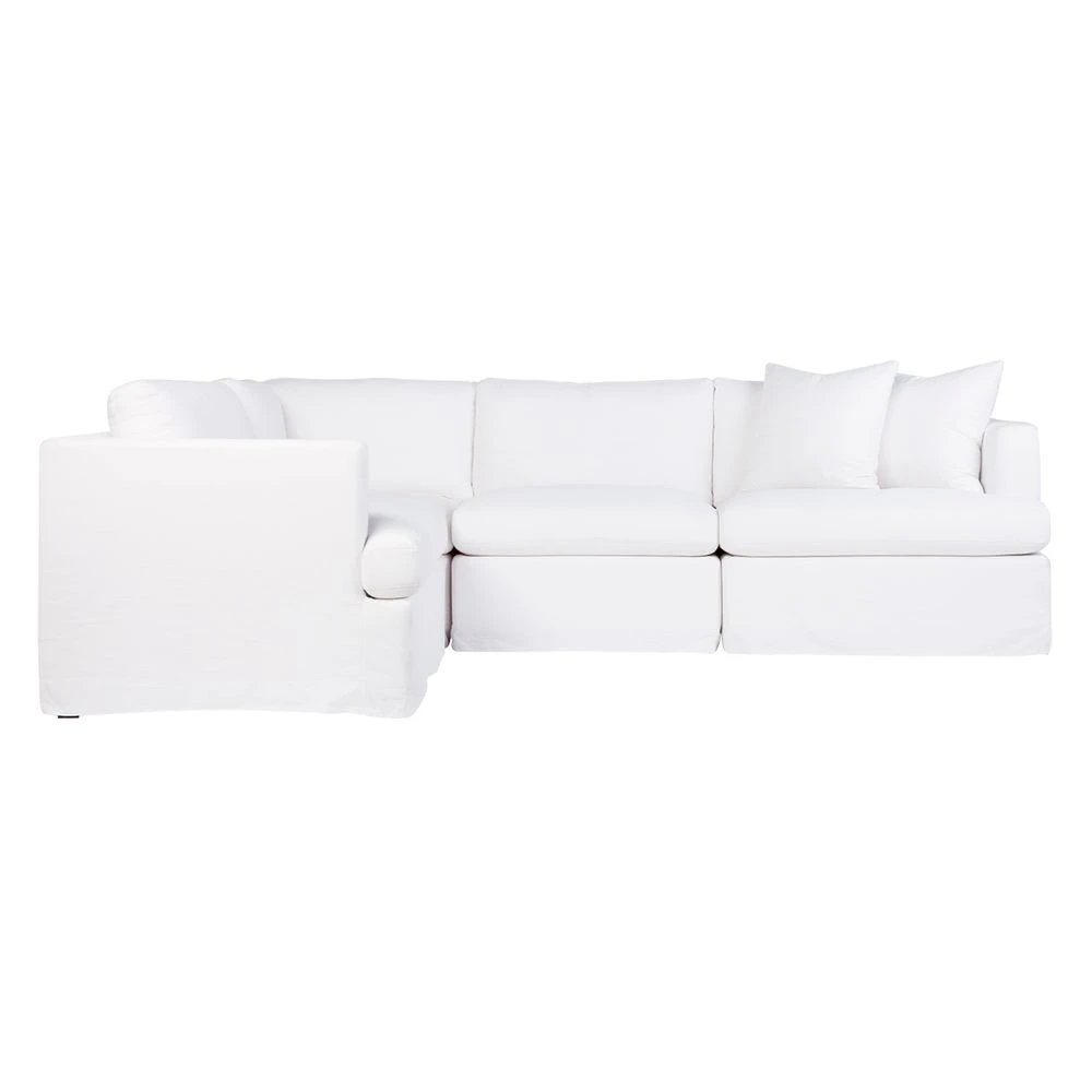 White linen slip cover modular sofa. Comfortable soft seating & back with feather & foam fill. Solid hardwood frame with inner spring suspension. Suits most décor from Hamptons, coastal and contemporary living. Slip cover with tailored sides are easily removed for cleaning. Includes a matching scatter cushion. Create your own style modular by adding pieces of the Birkshire range. Includes one matching scatter cushion.