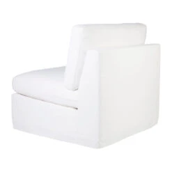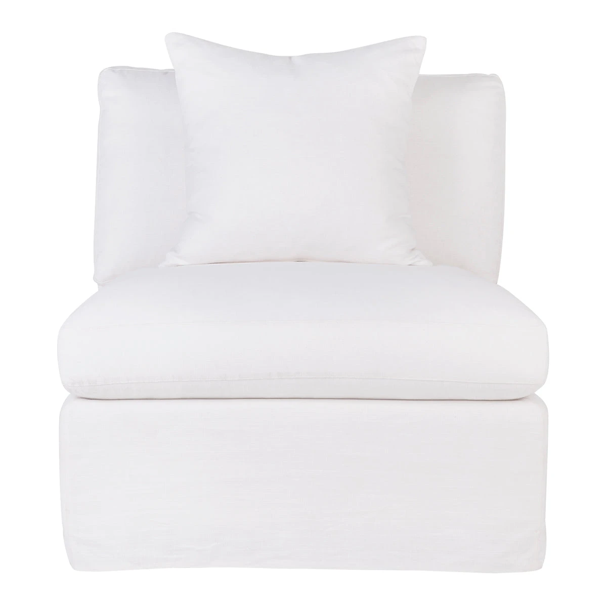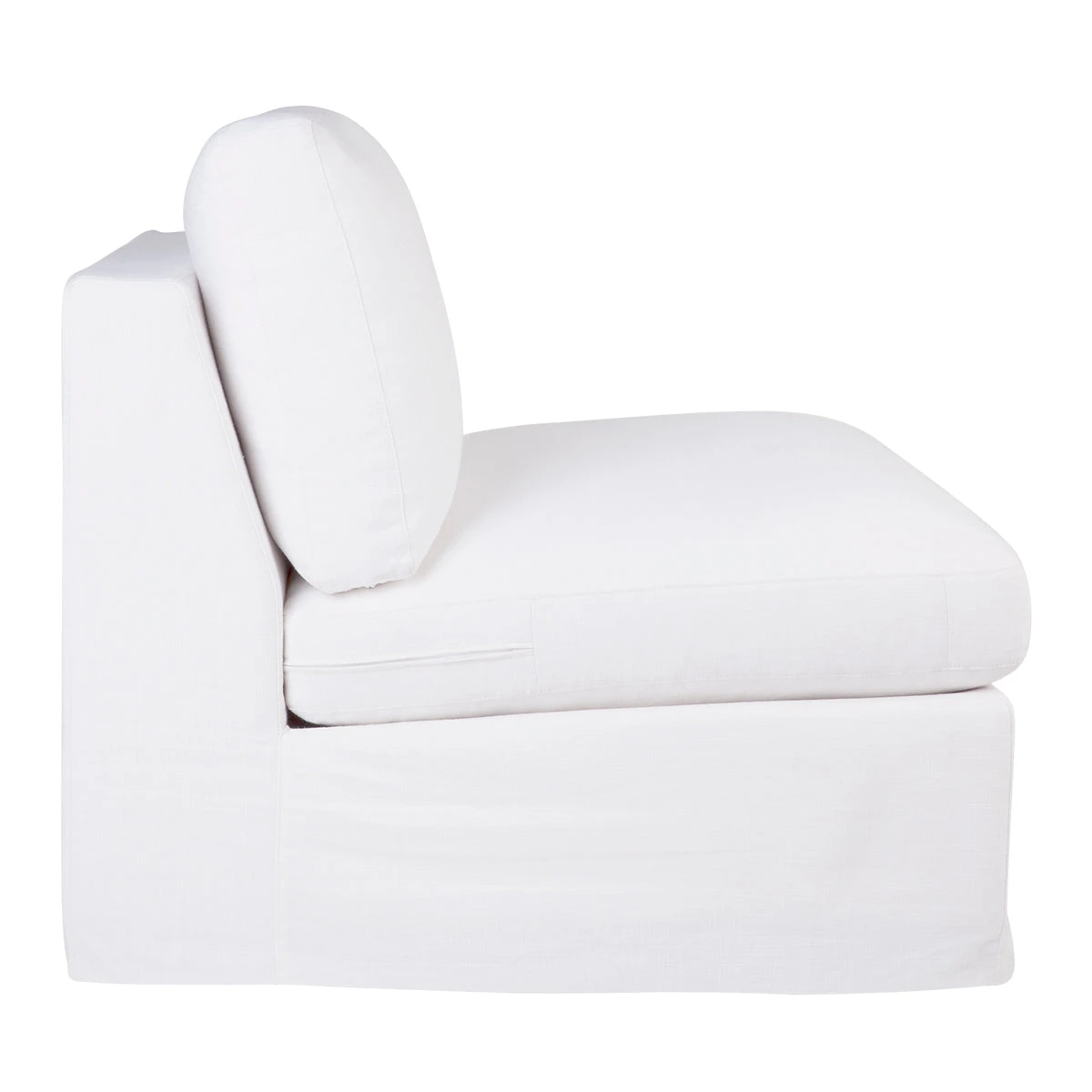 White linen slip cover occasional chair without arms. Comfortable soft seating and back with feather and foam fill. Solid hardwood frame with inner spring suspension. Suits most decor from Hamptons, Coastal and Contemporary living. slip cover with tailored sides and easily removed for cleaning. Includes one matching scatter cushion. Professional dry cleaning services recommended. Do not tumble dry.