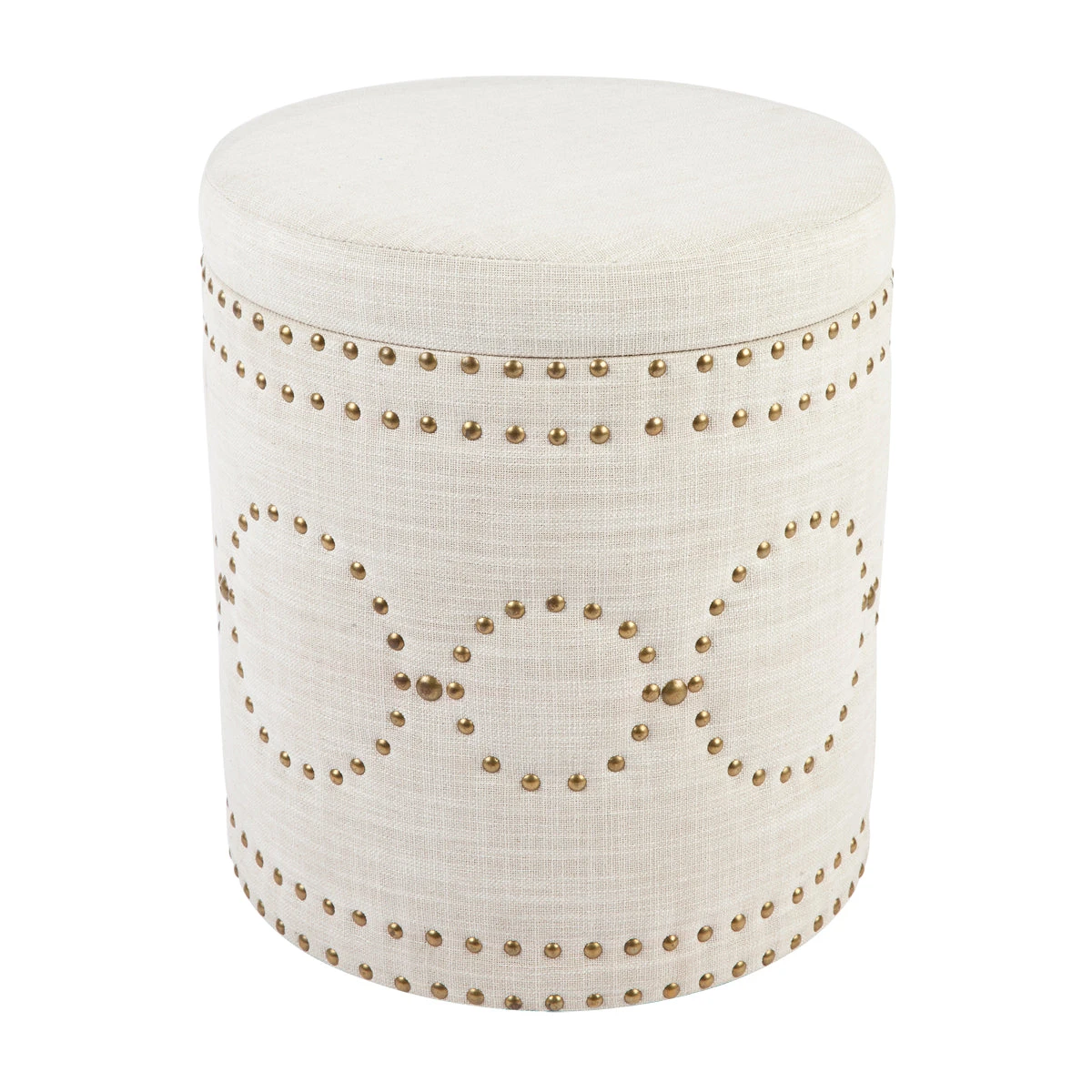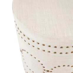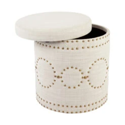 Undeniably chic, the Bradshaw round storage stool is upholstered in an elegant natural linen / viscose fabric offering gentle texture and durability. Perfectly proportioned as a casual seating or side table option, the Bradshaw is as stunning as it is versatile with distinctive bronze stud detailing in a classic circular design adding timeless glamour to this piece. The Bradshaw also features a removable lid revealing practical storage space, making it useful AND gorgeous – the total package!