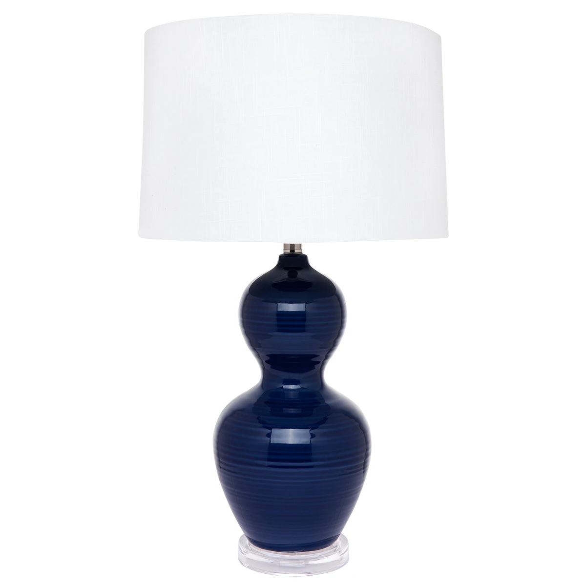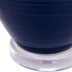 A classic nautical combination of crisp white and rich navy combine to stunning effect in our Bronte table lamp. Offering simple luxury, voluptuous curves make for a striking silhouette while the subtle ribbing on the navy glazed ceramic base offers delicate texture reminiscent of wave washed sands. Mounted into a clear acrylic base, the Bronte table lamp will set the scene of your contemporary coastal oasis. A soft to touch linen shade in pure white, ever so slightly tapered, completes the design.