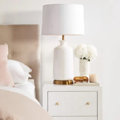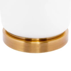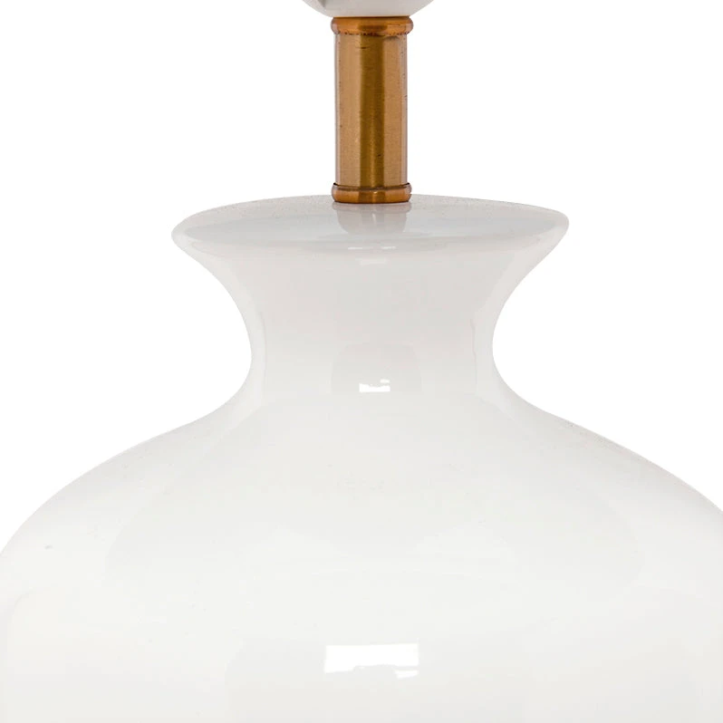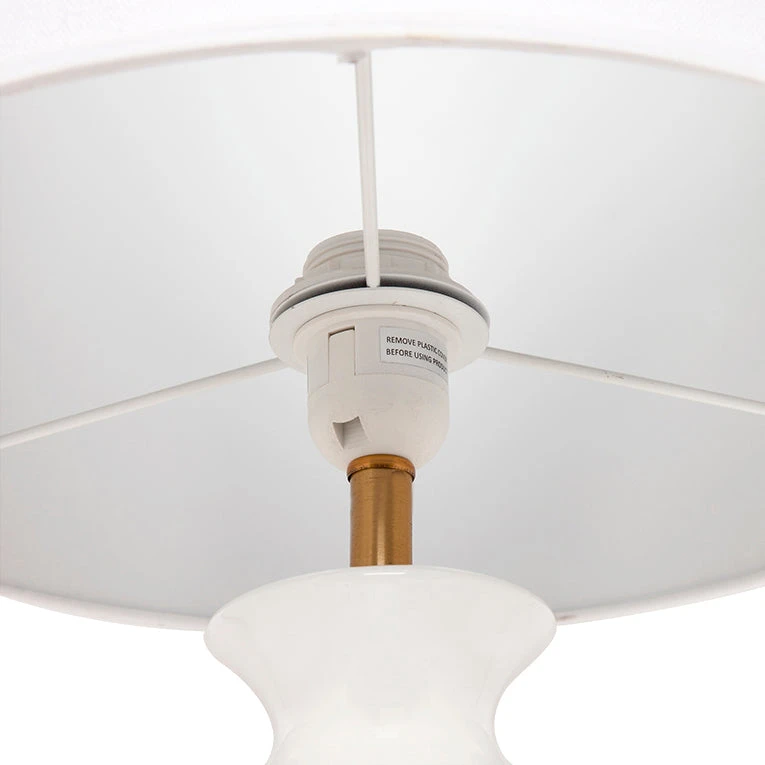 Simple and elegant with a smooth glazed white base accented with a gold plynth. The Camille Table Lamp is a design piece to compliment any room. This lamp is finished with a Drum White Linen Shade.