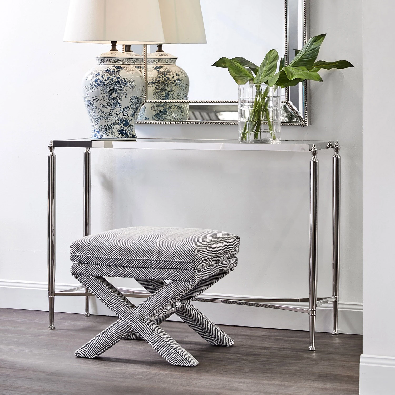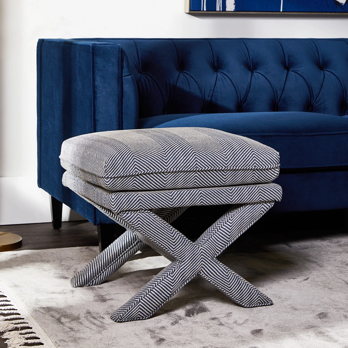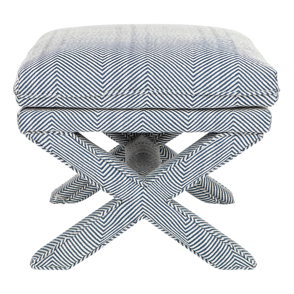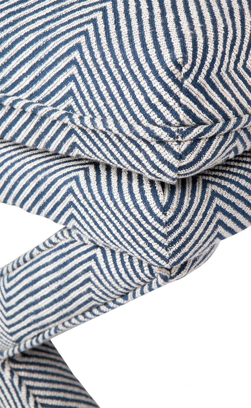 The Candace stool is classically upholstered in a quality blue and white chevron linen blend fabric with self-piped edging adding to its luxurious finish. Generous in size, the Candace stool sits comfortably with most decor styles from contemporary to coastal and Hamptons interiors. A perfect side in your living or bedroom space, the Candace stool also looks great styled as a pair. Coordinate with our popular Candace occasional chair or cushions for the ultimate tailored interior.