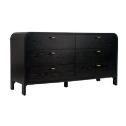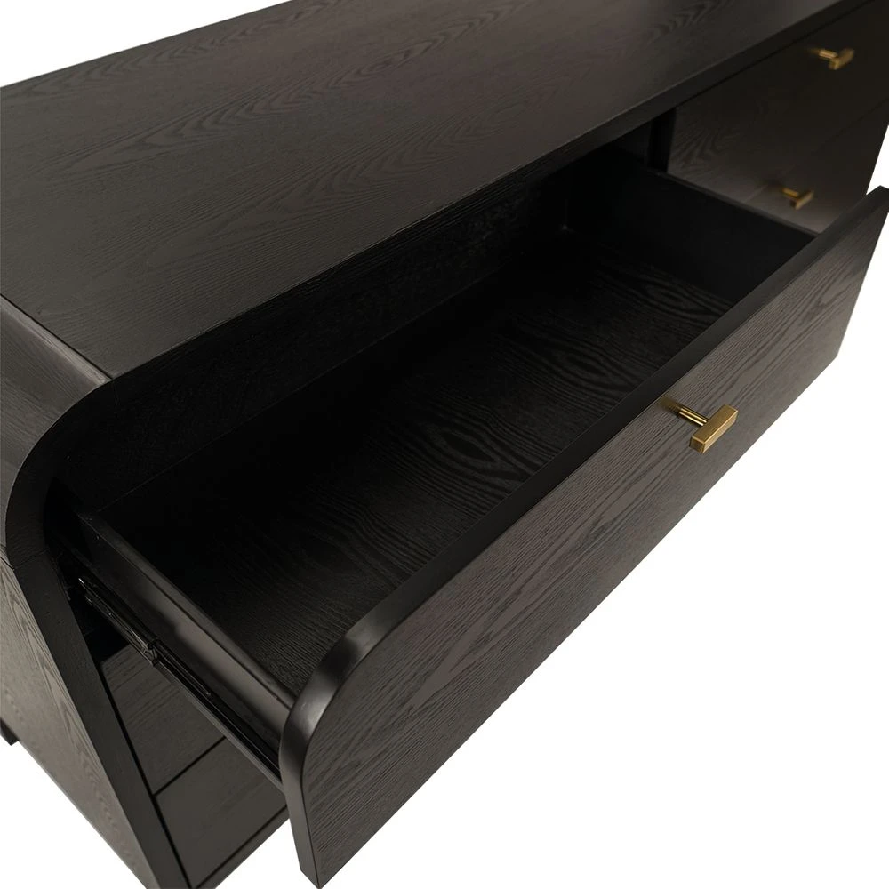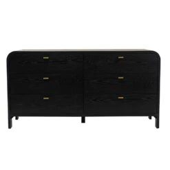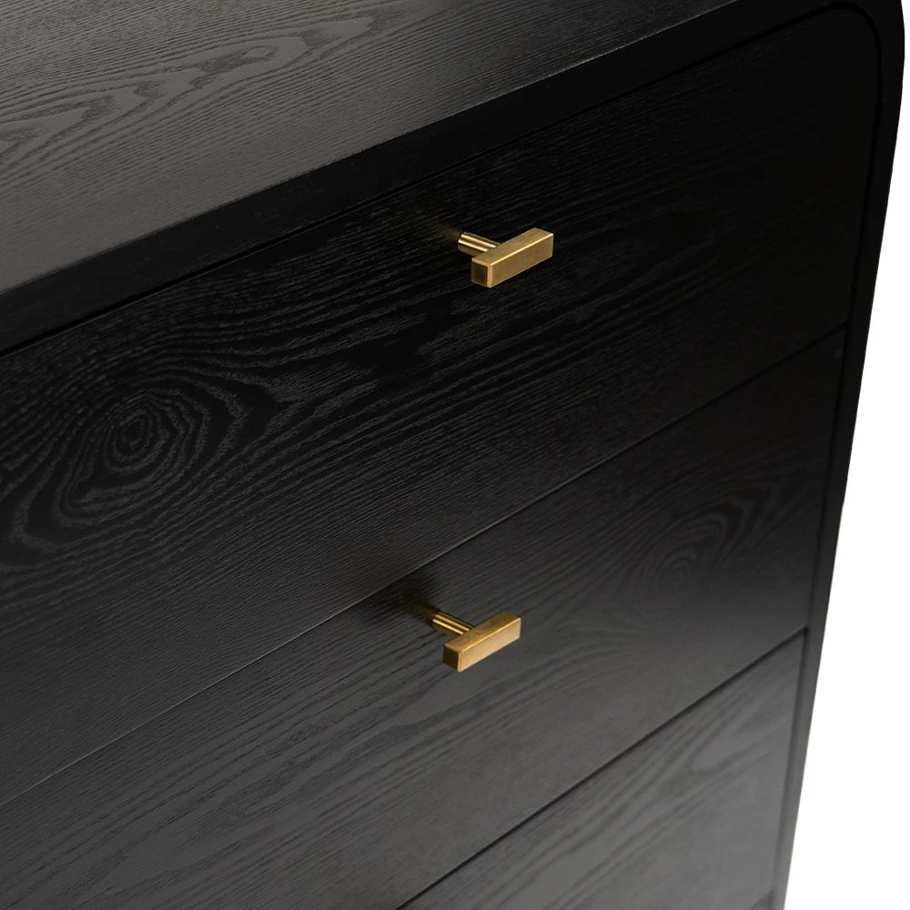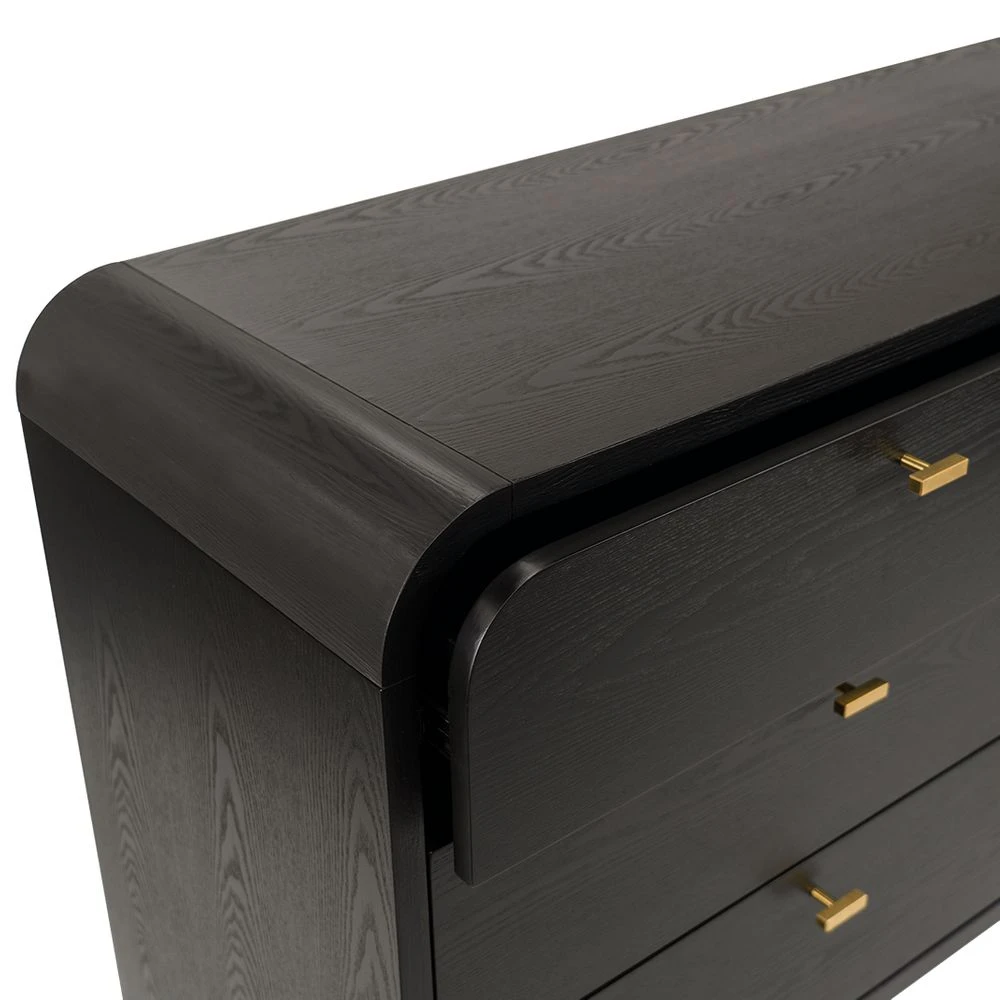 The epitome of elegant sophistication, the Chisholm oak 6 drawer chest transcends time with its enduring appeal. Featuring a gently curved silhouette crafted from beautifully grained oak veneer in a chic black painted finish, the dark and moody Chisholm oak 6 drawer chest offers true versatility with a touch of drama. Chisholm’s exquisite lines are enhanced by six deep drawers on soft close runners, with elegant brushed gold T-bar handles adding a refined touch of luxe. A quality furniture piece that is both beautiful and functional, the Chisholm range is also available in white and includes a matching bedside table.