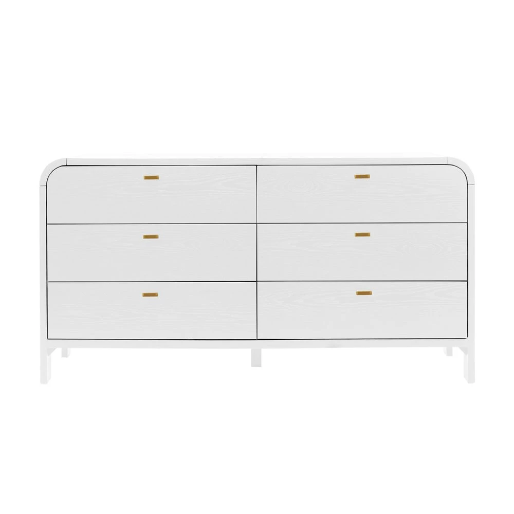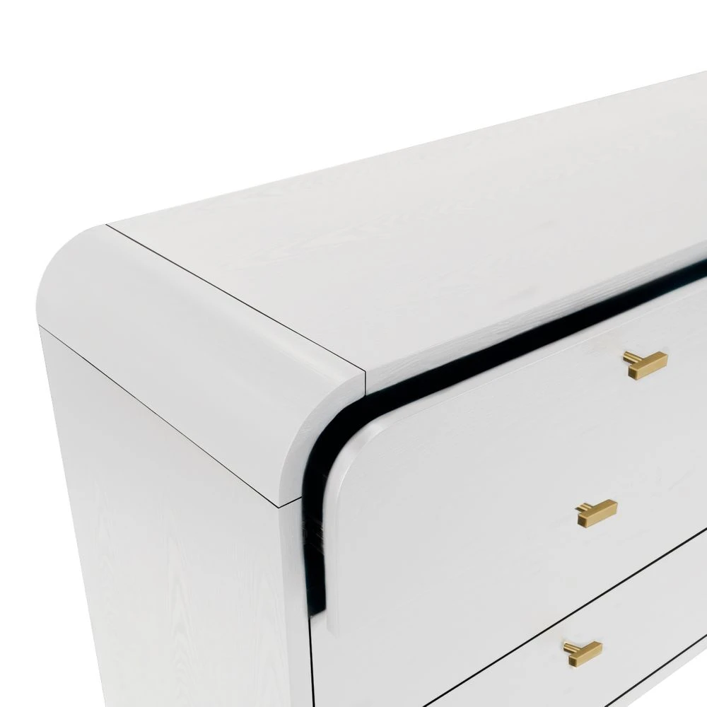 Elevating interiors with its sophisticated design, the Chisholm oak 6 drawer chest transcends time with its enduring appeal. Featuring a gently curved silhouette crafted from beautifully grained oak veneer in a white painted finish, the Chisholm oak 6 drawer chest offers true versatility with a touch of drama. Chisholm’s exquisite lines are enhanced by six deep drawers with soft close runners and elegant brushed gold T-bar handles, creating a furniture piece that is both beautiful and functional. The Chisholm range is also available in black finished oak and includes a matching bedside table.