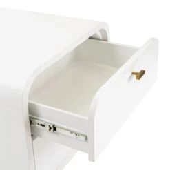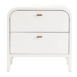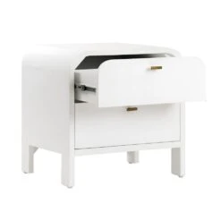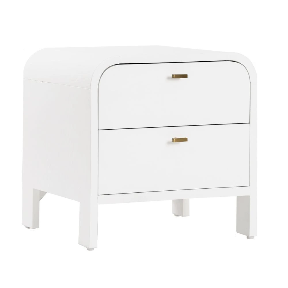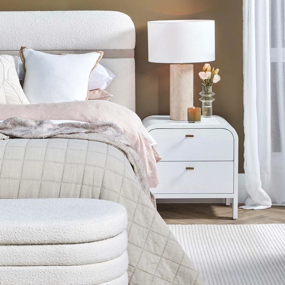 The Chisholm oak bedside table is designed for modern interiors that are seeking timelessness. Featuring a gently curved silhouette crafted from beautifully grained oak veneer in a fresh white painted finish, the Chisholm oak bedside table offers true versatility. Chisholm’s sleek, sophisticated lines are enhanced by two deep drawers with soft close runners and elegant brushed gold T-bar handles, creating a furniture piece that is as functional as it is beautiful. Also available in a matching chest of drawers.