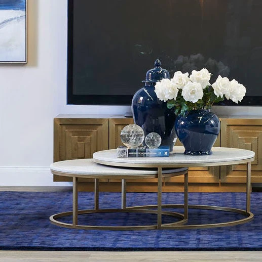 Boasting sleek modern aesthetics, the 2pc Chloe nesting coffee table features a luxurious polished, natural crystallised stone top with a smooth rolled edge, supported by an elegant antique gold finished iron frame. Creating a striking surface for display, the pairing of opulent stone with the lustre of cool metal makes for a perfectly complementary combination. Built to last, the clean-lined Chloe nested coffee table creates a versatile centrepiece that is highly durable and undeniably chic.