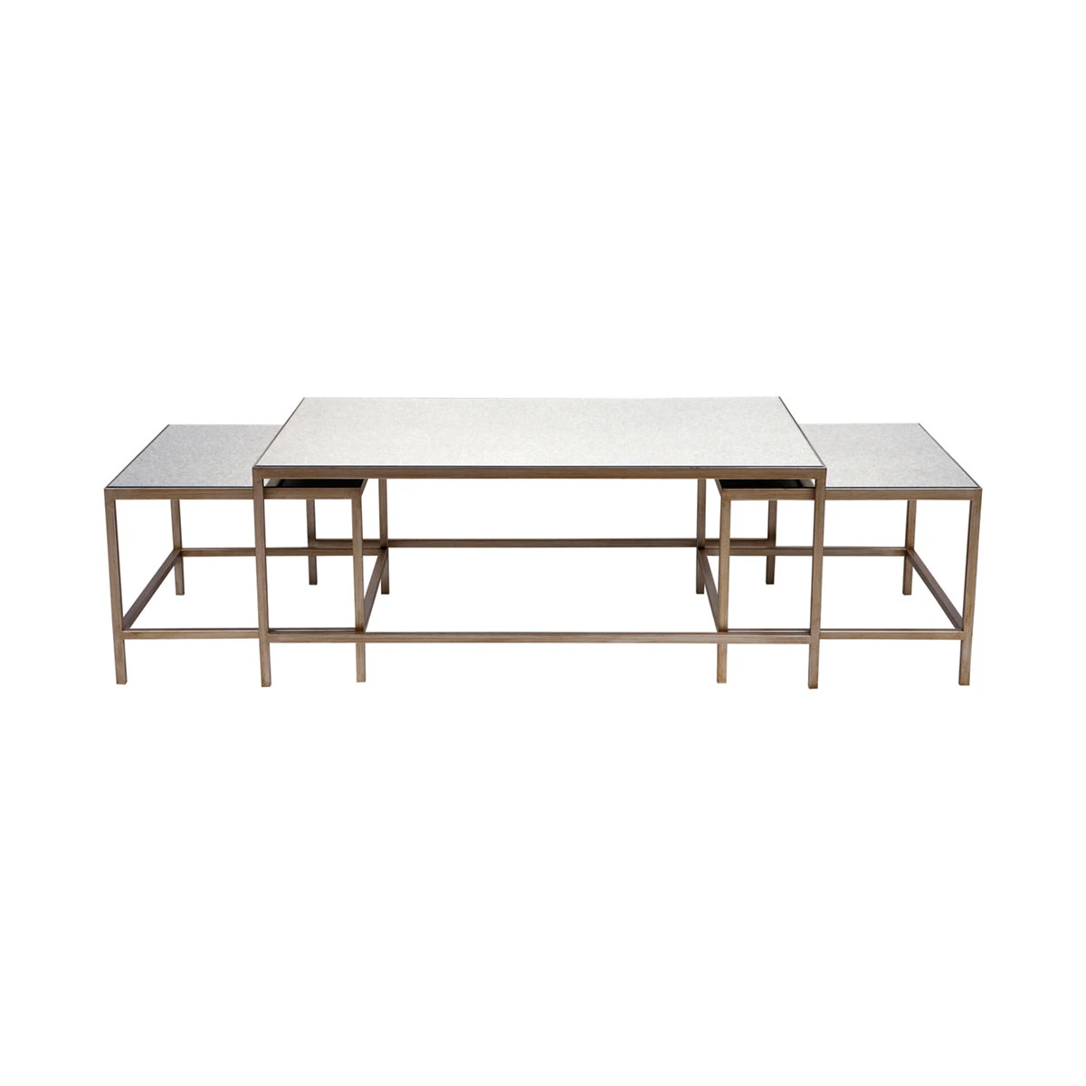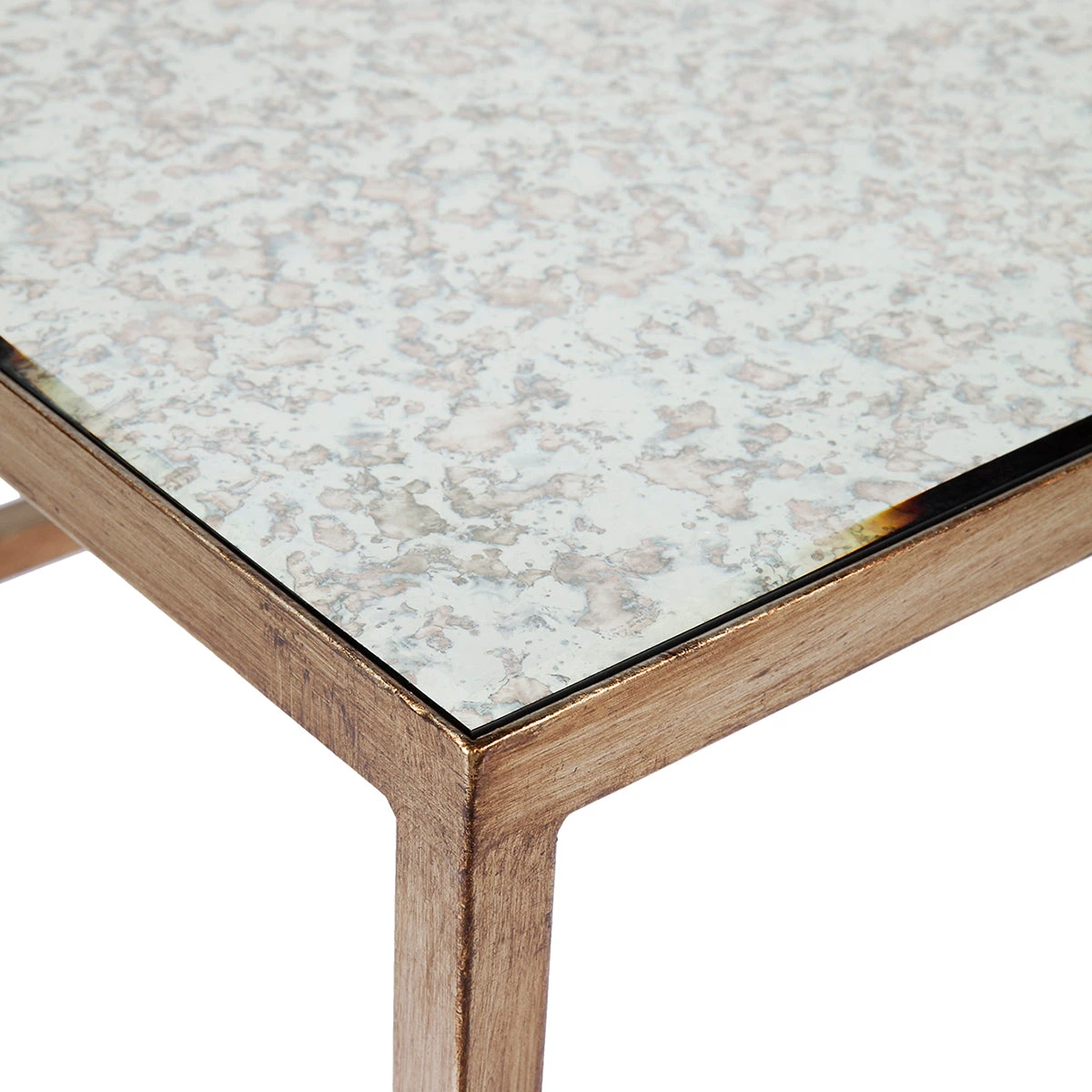 Making a striking centrepiece, the strong lines of the three piece Cocktail mirrored nesting coffee table have been inspired by modern architecture where the gentle lustre of antique mirrored glass tops are braced by elemental iron frames finished in an elegant antique gold. The clean, linear silhouettes form an ideal surface for displaying statement pieces. Two smaller tables are nested beneath the coffee table, creating an elegant layered effect and providing additional space when required.