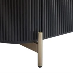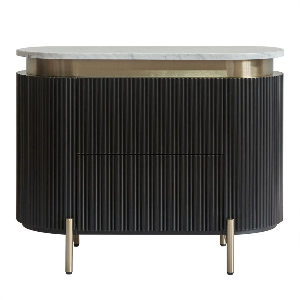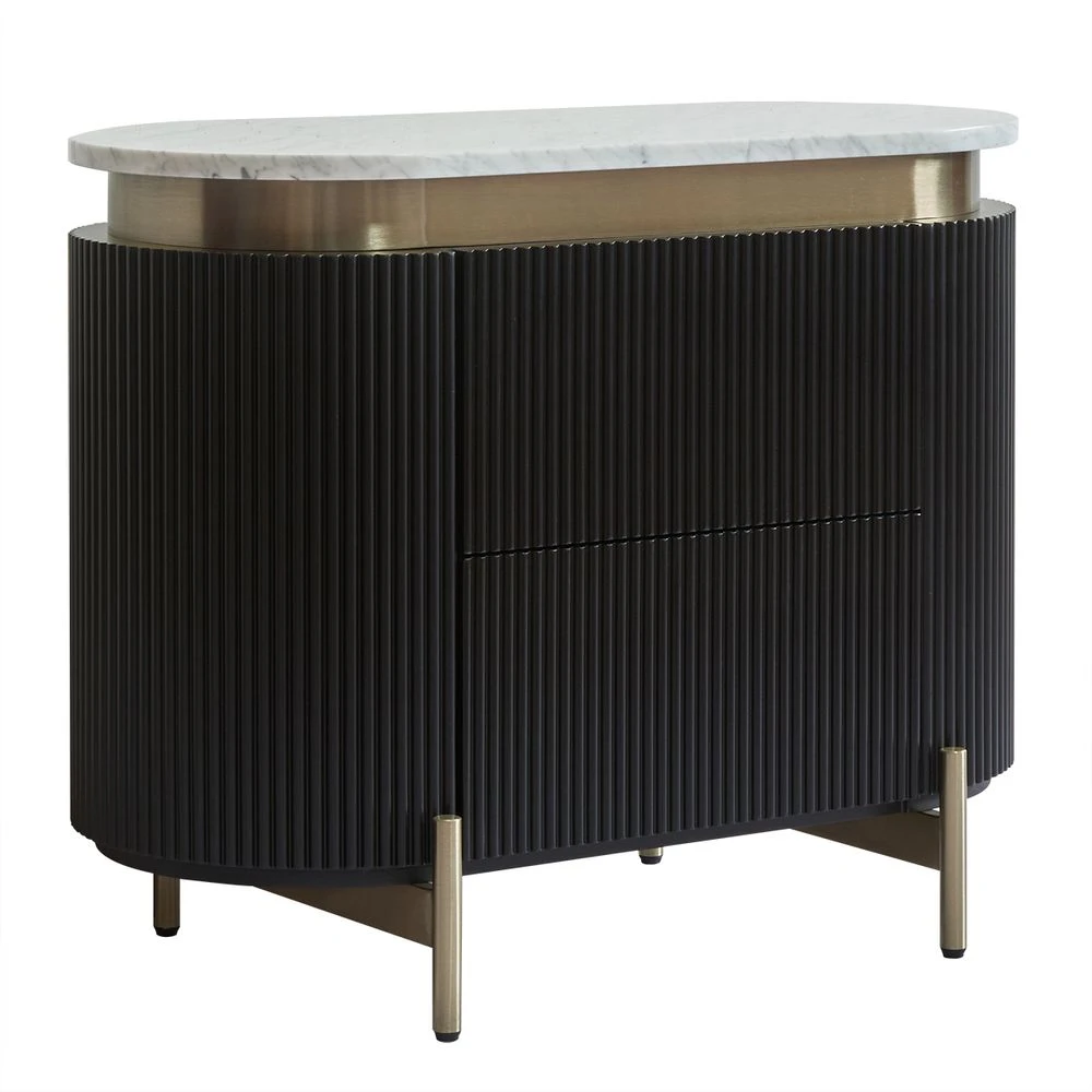 An elegant blend of contemporary style and functional design, the Demarco bedside table in black boasts a mid-century modern profile with stunning ribbed detailing. Its smooth white Carrara marble top is perfectly complemented by brass-finished accents and slender iron legs. Spacious drawers provide ample storage while maintaining a sleek, sophisticated look. A refined addition to any bedroom, this piece offers a timeless touch of luxury.