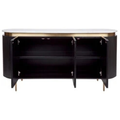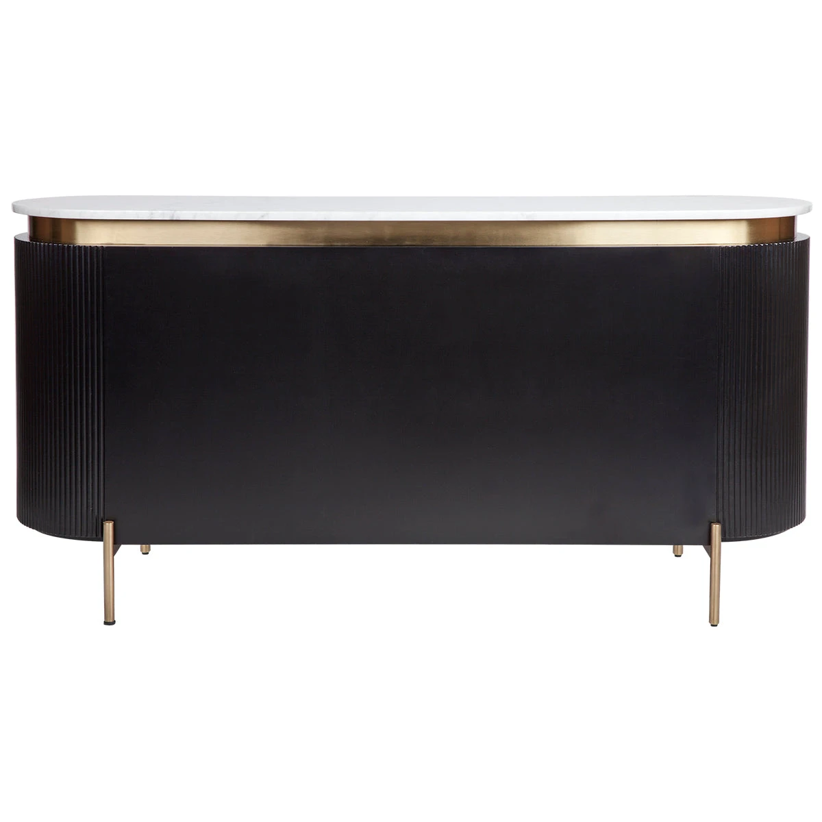 An enduring example of expert craftsmanship, the Demarco buffet boasts contemporary curvature and style with its mid-century modernism profile and detailed ribbed facing finished in a chic black satin. The attention to detail on this sleek and sophisticated piece adds to its confident charisma. Streamlined brass finished iron legs and slender gold plinth support a perfectly curved white Carrara marble top adding striking contrast to this timeless combination. Concealing an adjustable shelf and co-ordinating black finished interior, the Demarco buffet offers ample storage and is a glamourous testament of elevated form and function.