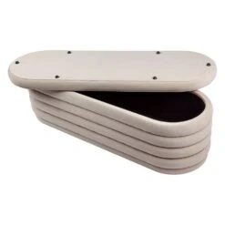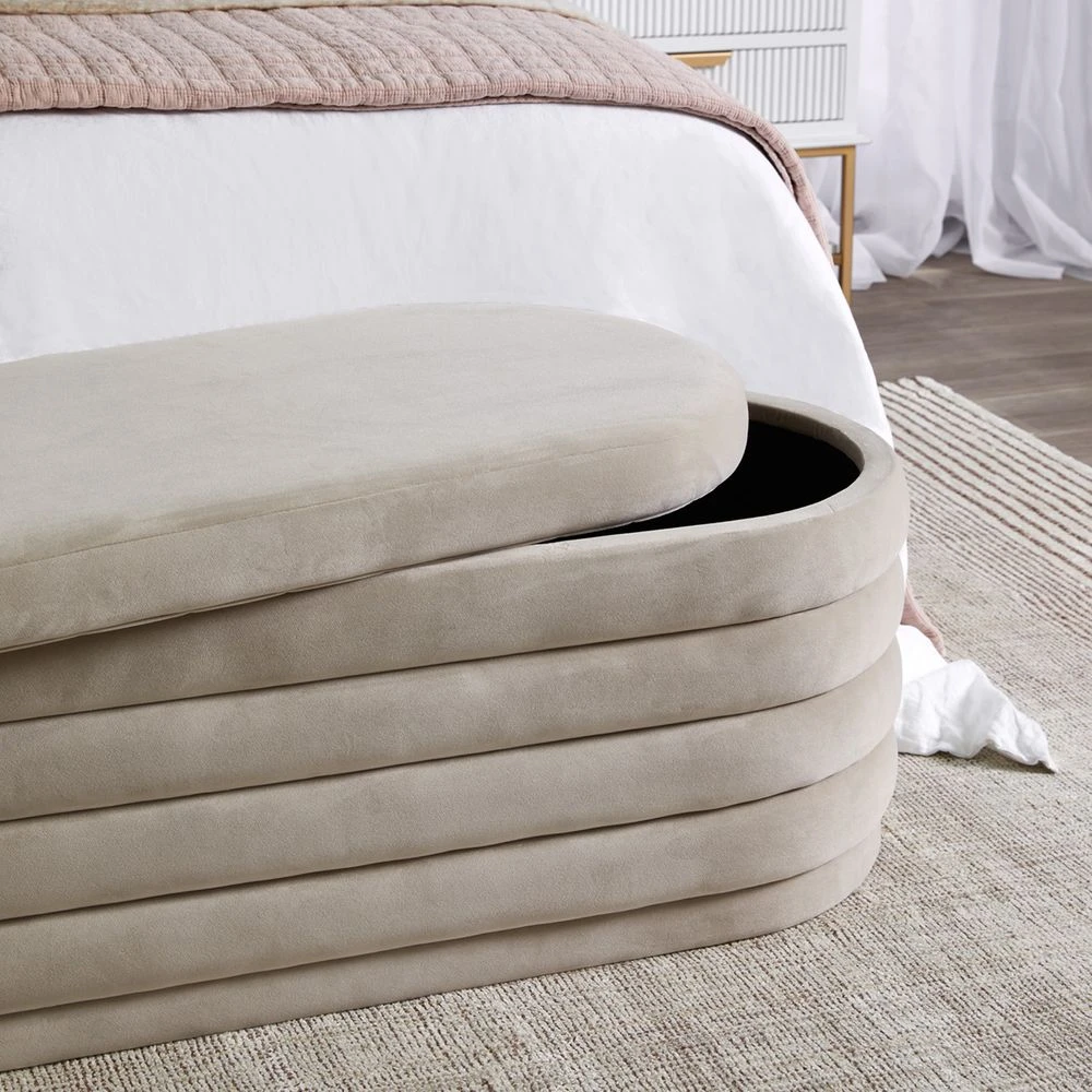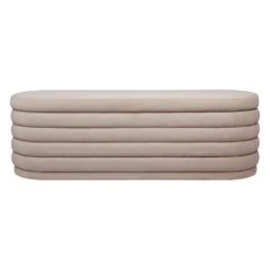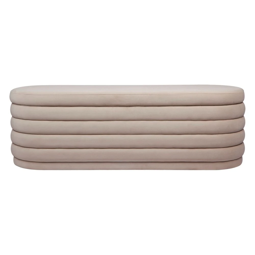 Upholstered in sumptuous nude velvet, the gentle tones and softened profile of the Demi storage bench ottoman lends a sense of sophistication to any space. Designed with an effortlessly chic cosmopolitan mood in mind, the panelling detail of the Demi storage bench ottoman enhances its textural quality and adds to its contemporary curve appeal. As practical as it is beautiful, lift the lid on the Demi to reveal ample storage – easy access for throws and cushions when styled as a bed end, hats and shoes when adorning a stylish entry or an Ideal hiding spot for books and games when used as additional living room seating. Also available in black or olive velvet, tactile white boucle and off-white linen.