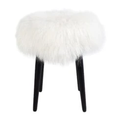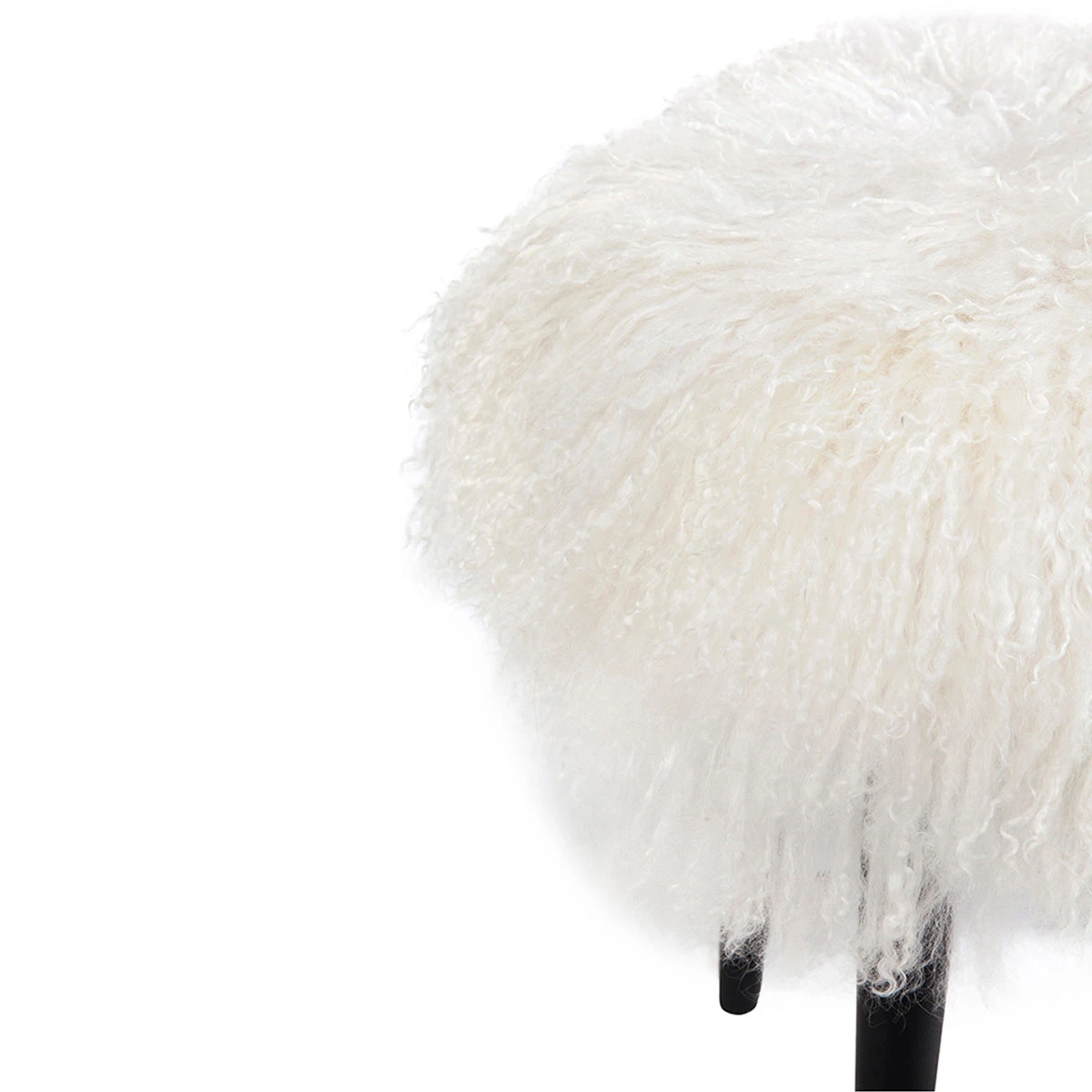 Mongolian lamb white plush stool with black tapered steel legs. Some assembly is required.