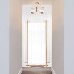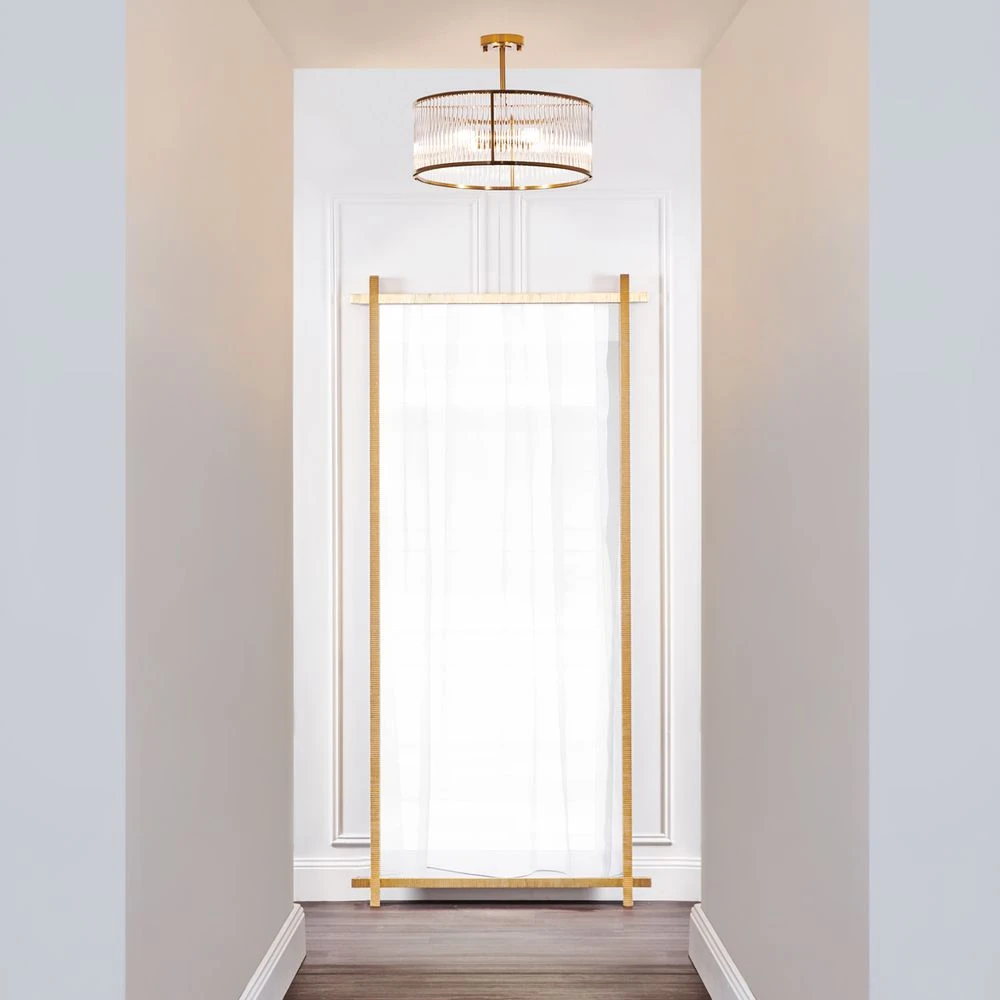 Understated luxury, the Farrah Flush Mount features a stunning rounded shade with a stylish brushed brass finished metal frame encasing a mesmerising display of cylindrical glass rods. Inspired by modern moods, the Farrah flush mount creates a single, elegant statement that would work well on low ceilings, or centred above a chic dining space, creating an atmosphere of indulgence with its opulent glow. An elegant cousin to the ever popular Hexad Flush Mount in Antique Brass. Also available in a black finish.