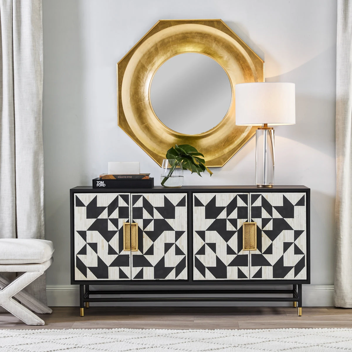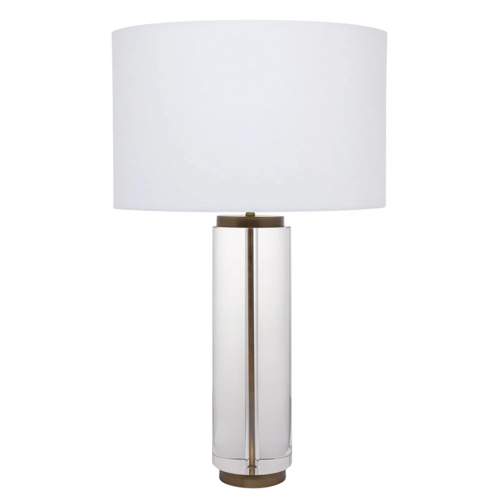 With a body made of a solid clear crystal column , the Forrester Table Lamp draws inspiration from the works of artisan transparent designers. The lamp`s transparency is accented by a brass rod through the crystal and a matching plinth. It is topped with a white linen shade.