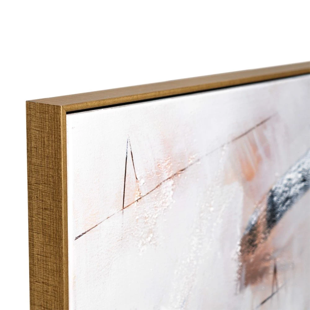 Featuring gorgeous earth tones of ochre, onyx and oak, Freeform oil on canvas painting celebrates a sense of unbridled movement with layering’s of texture and tone underpinning abstracted line work montaged with an organic placement of form. A beautifully balanced composition, Freeform oil on canvas is hand painted by skilled artists in oil and mounted in a chic antique gold shadow box frame.