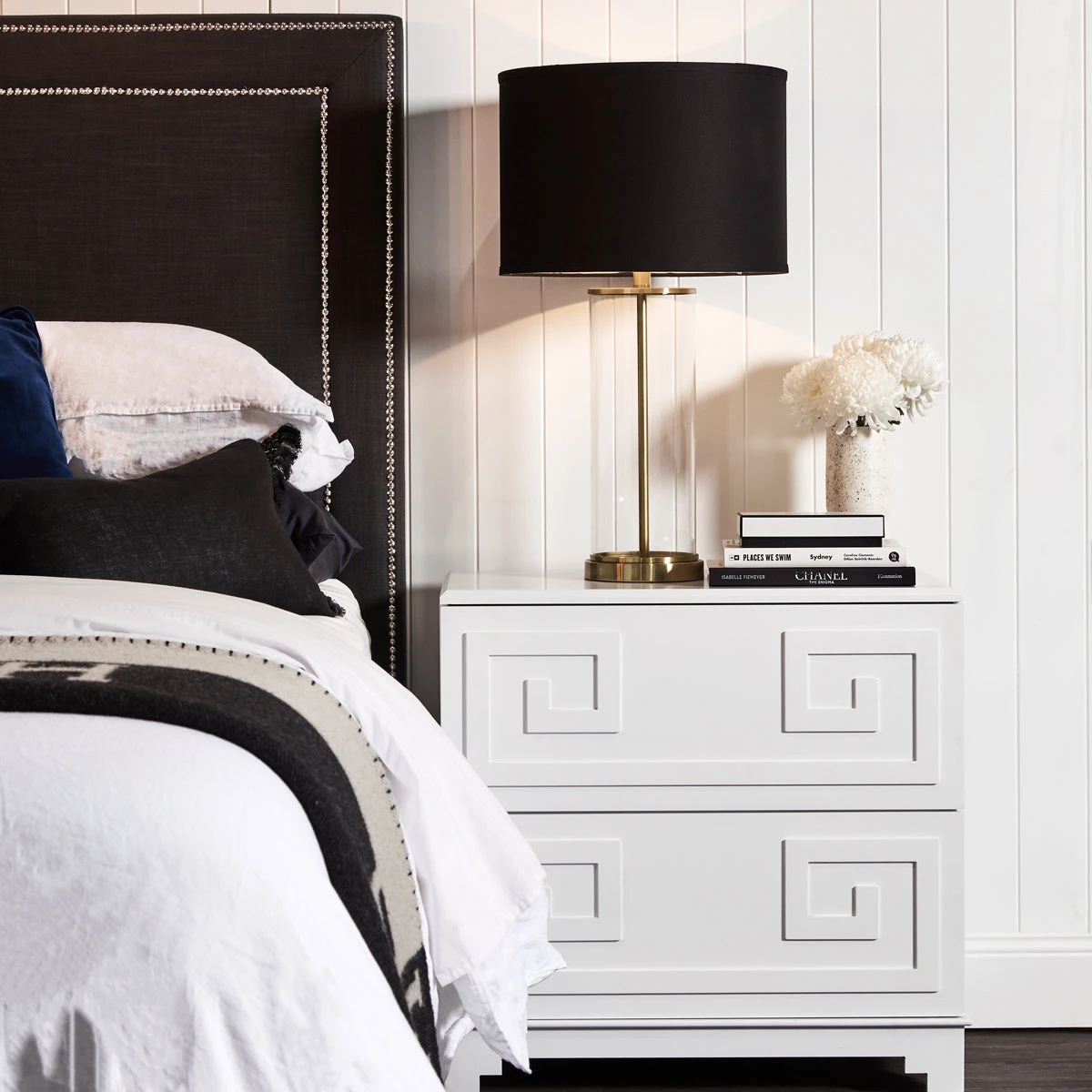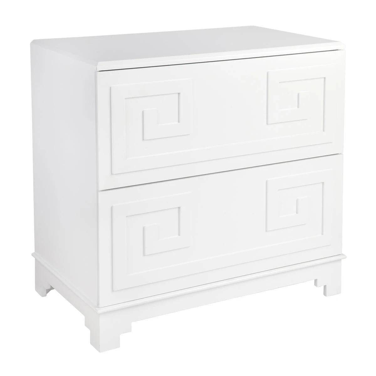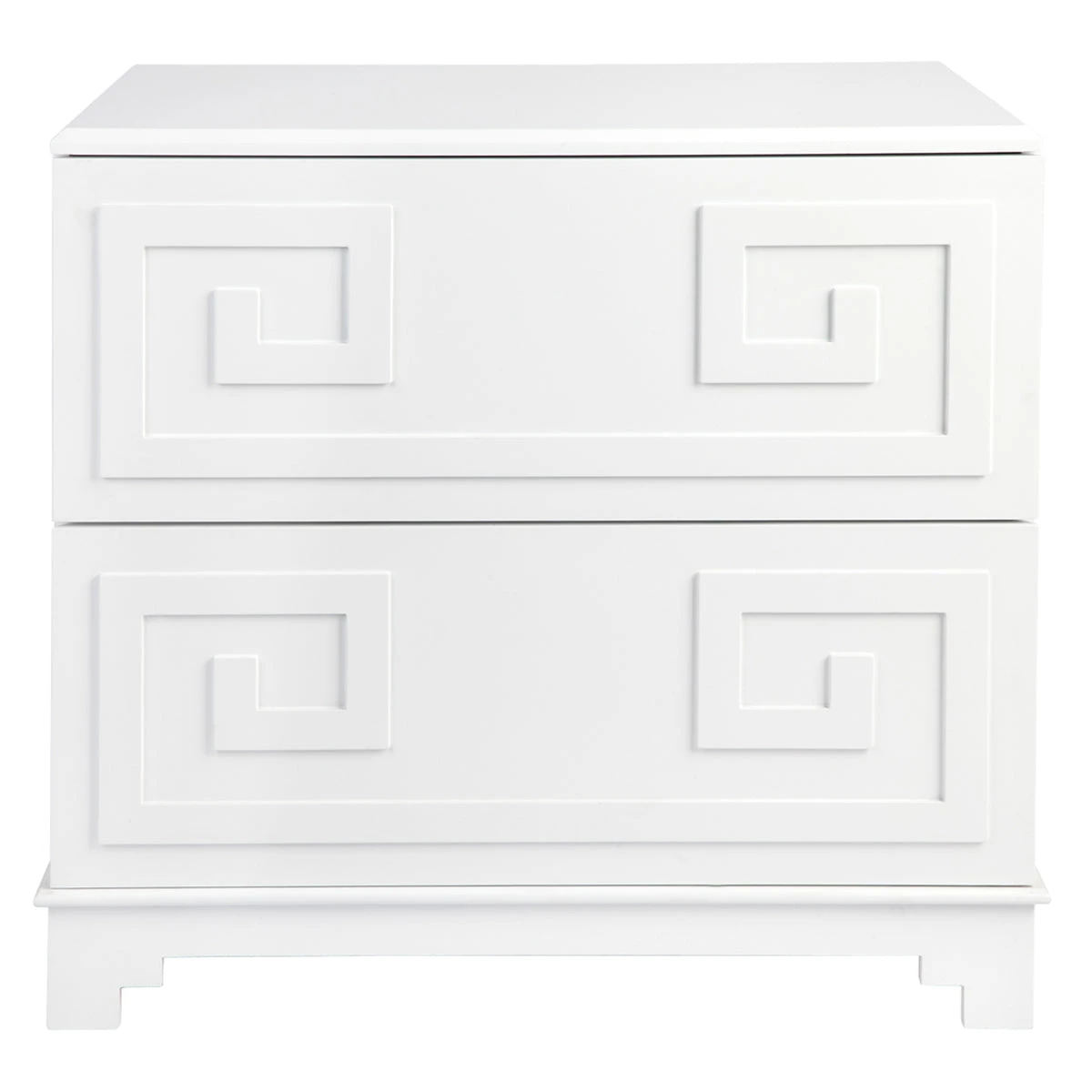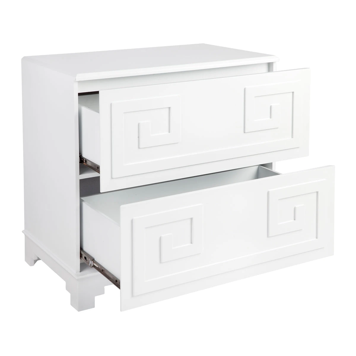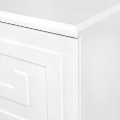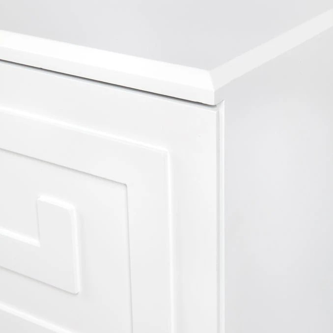 The Greek key bedside table merges inspiration drawn from ancient Greek symbolism together with the bold use of colour and contrast typical to a Hollywood Regency design style to deliver a sense of grandeur and opulence. A continuous linear Greek Key symbol, representative of eternity and unity, adorns this two drawer bedside table with a classic white lacquered finish. Generously proportioned, the Greek Key bedside table offers style and practical storage solutions for your bedroom space.