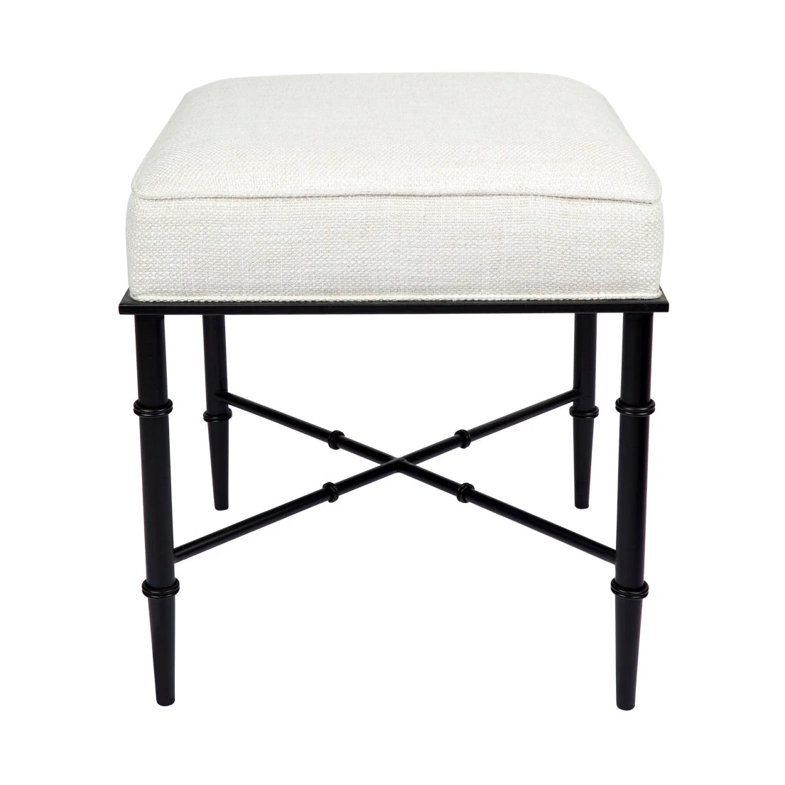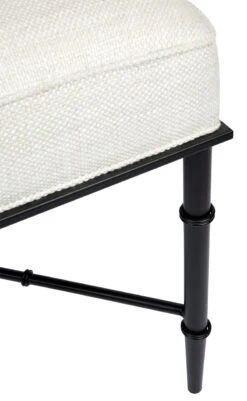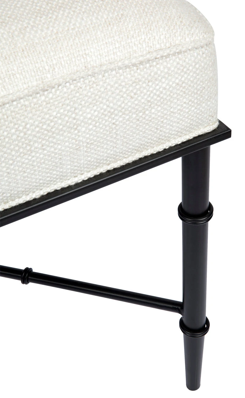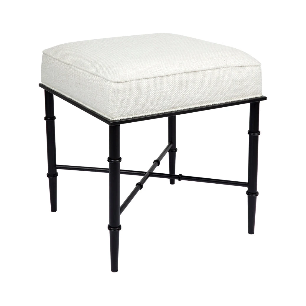 This versatile stool features gorgeous banded bamboo-inspired iron legs in a matte black finish. Filled with foam, its natural linen blend cushioned seat adds classic texture and creates a useful footrest, seat, or side table when topped with a tray. Complete with a tailored self-piping edge, the Hacienda stool is a striking piece of furniture that fits well into a variety of interior styles including Hamptons, provincial, coastal, and contemporary.