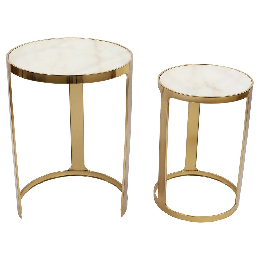 Add elegance and functionality to your living space with these stunning nesting side tables. Featuring sleek gold-finished frames and smooth marble-effect tops, these tables exude luxury and sophistication. Designed to nest together for compact storage or to be used separately, they offer versatile styling options for both modern and classic interiors. Perfect for displaying decor, holding beverages, or adding a chic accent, these nesting tables blend practicality with timeless design, enhancing the aesthetic of any room.