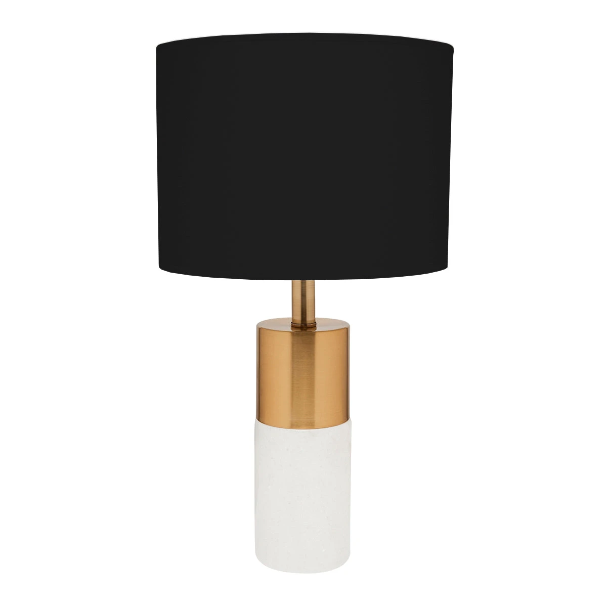 Citing inspiration from the luxury furnishings of a Mykonos resort, this table lamp pairs a cylindrical marble base with brass-finished accents and a Black Linen Drum Shade.