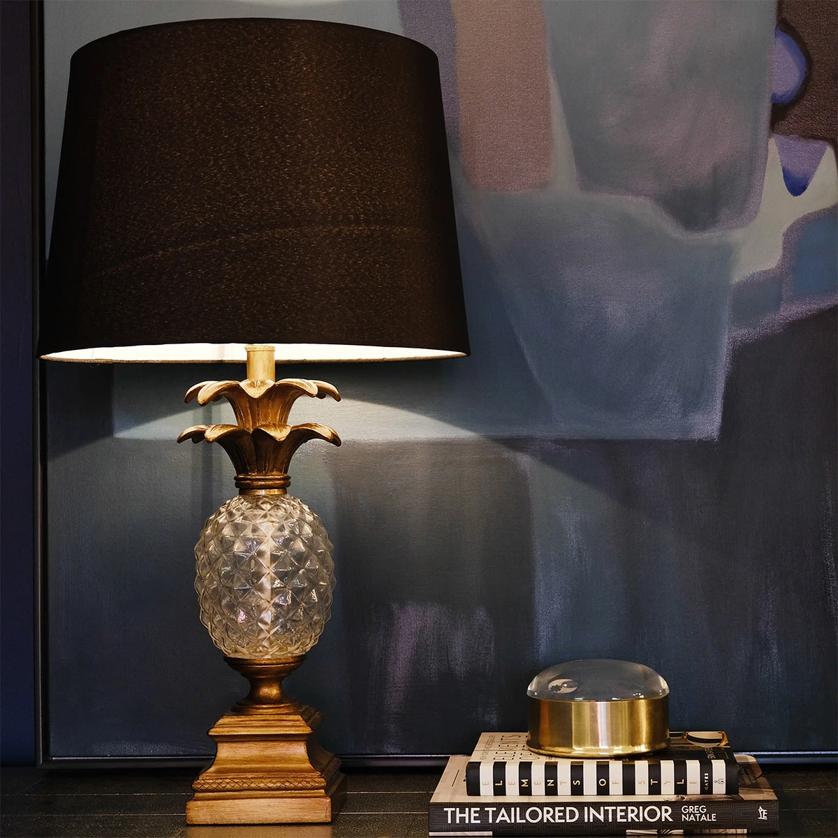 Create a seaside vibe with a touch of luxe with this Pineapple shape table lamp. The antique gold resin base plus the clear glass cut pineapple is finished off with a black linen tapered drum shade.