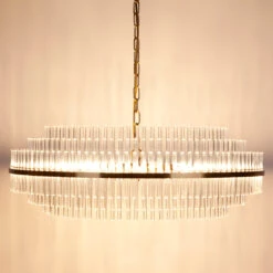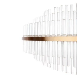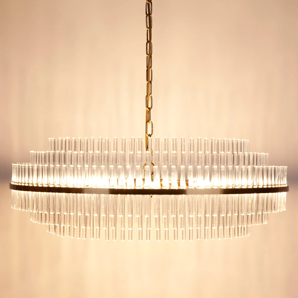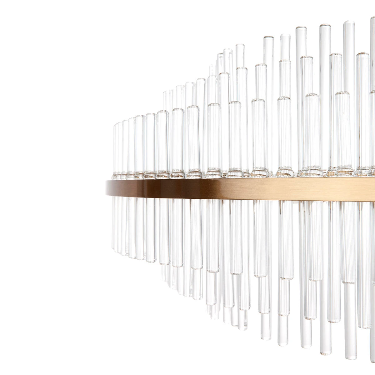 Grand in size and sculptural form, the Lawrence pendant finds a sense of balance between exceptional elegance and extraordinary drama. Crafted with hundreds of clear glass rods delicately dangling from a polished brass frame, the design echoes art deco glamour. The Lawrence pendant commands any living space