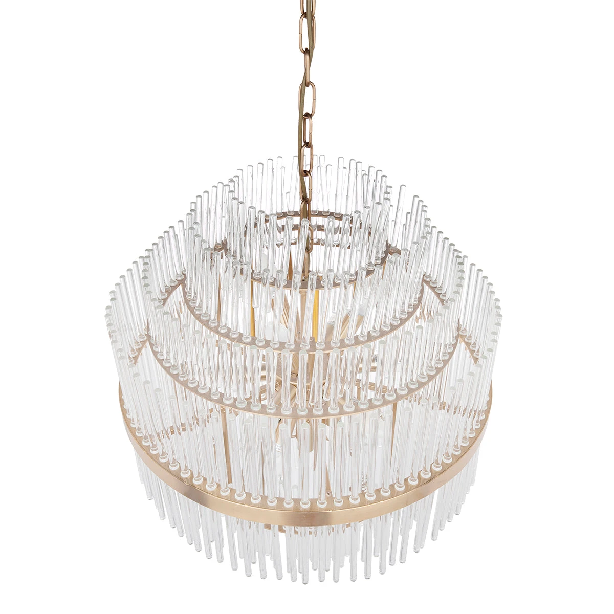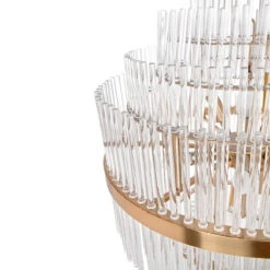 Grand in size and sculptural form, the Lawrence pendant finds a sense of balance between exceptional elegance and extraordinary drama. Crafted with hundreds of clear glass rods delicately dangling from a polished brass frame, the design echoes art deco glamour. The Lawrence pendant commands any living space