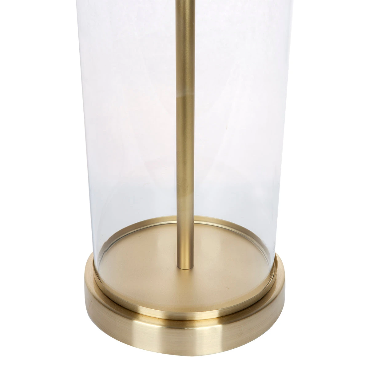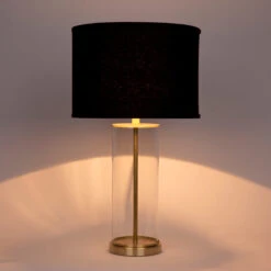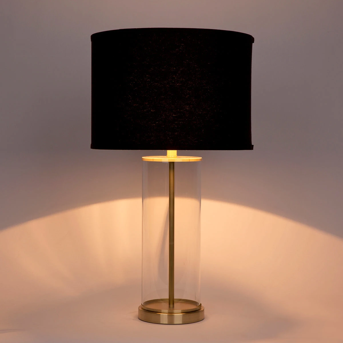 The Left Bank Table lamp is a modern glass table lamp and would be a sleek addition to any space. Features a brass finish metal rod encased in a clear glass cylinder base trimmed with matching brass metal. Topped with a black linen drum shade.