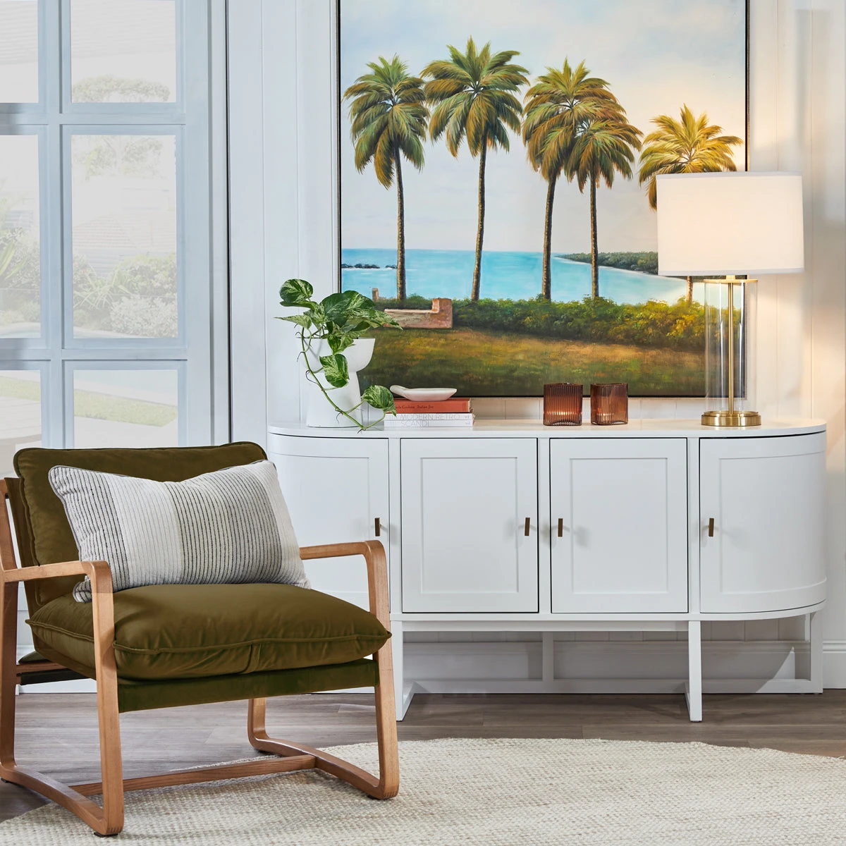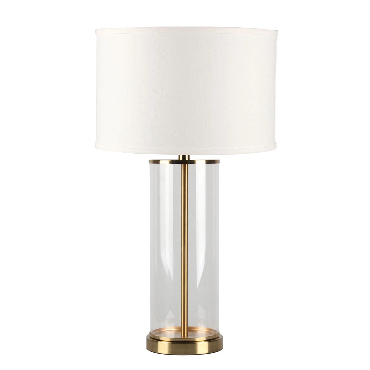 The Left Bank Table lamp is a modern glass table lamp and would be a sleek addition to any space. Features a brass finish metal rod encased in a clear glass cylinder base trimmed with matching brass metal. Topped with a white linen drum shade.