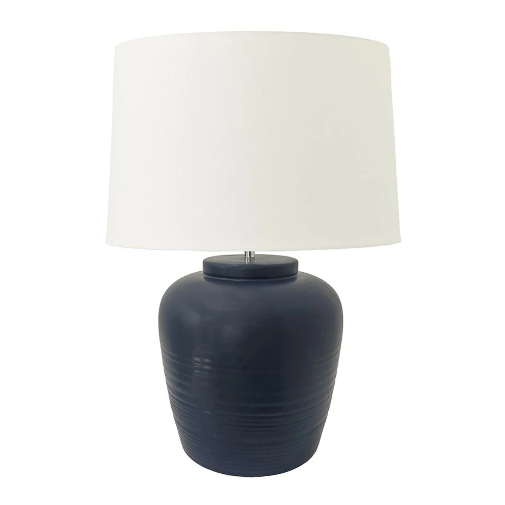 The ceramic table lamp features a rich matte navy blue base with subtle ribbed detailing, paired with a classic white fabric shade for timeless appeal. Perfect for modern or transitional interiors, it provides soft ambient lighting, ideal for bedrooms, living rooms, or workspaces. The navy hue adds a sophisticated touch, making this lamp a stylish yet functional accent for any space.