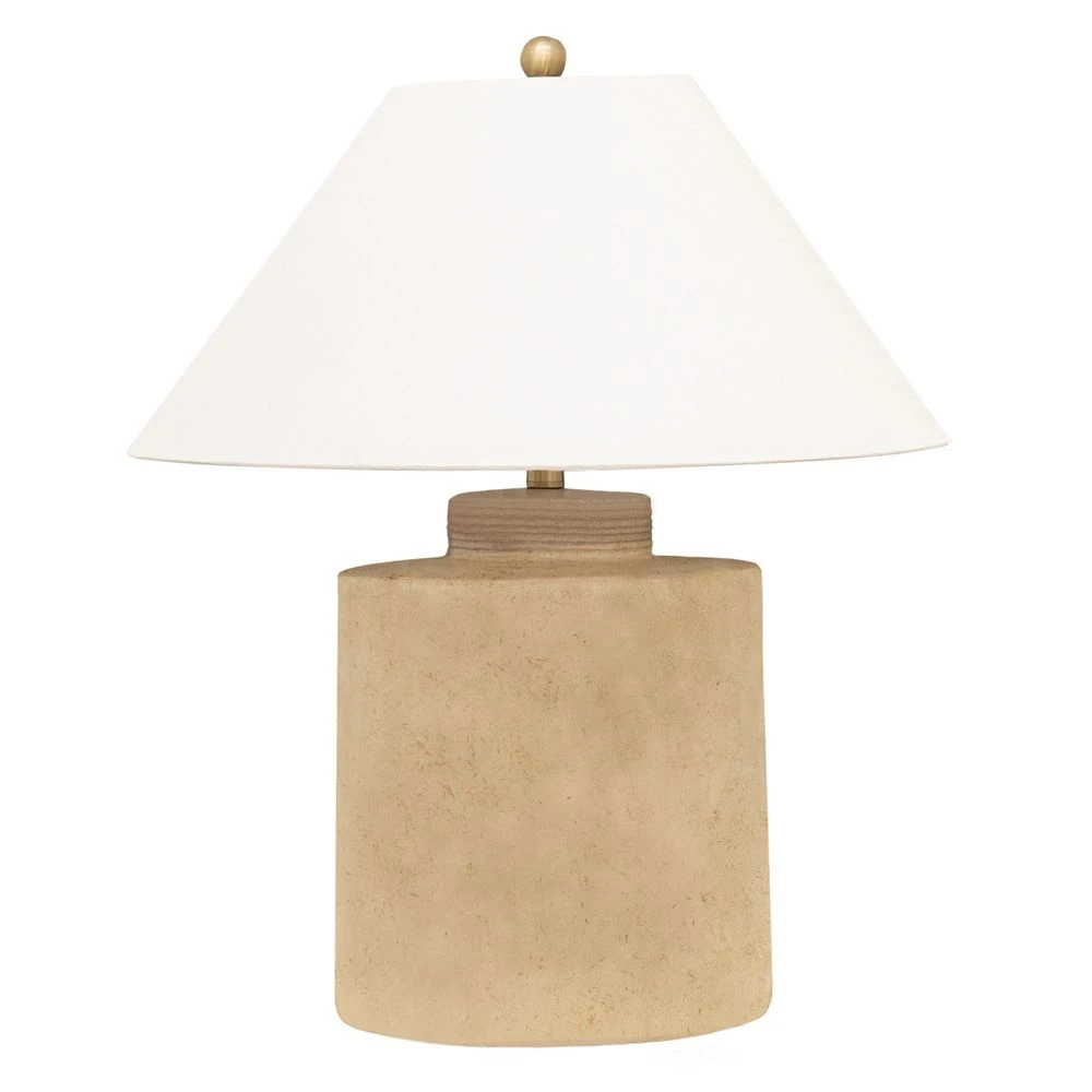 Introducing the Lisbon Table Lamp, a stunning addition to any home decor. This robust lamp features a cylindrical shape and is painted in soothing washed sandy, brown tones. The white faux linen tapered shade adds a touch of elegance, while the electroplated brass harp and finial add a luxurious touch. The perfect blend of natural elements and luxurious accents, this lamp creates a harmonious ambiance in any room.