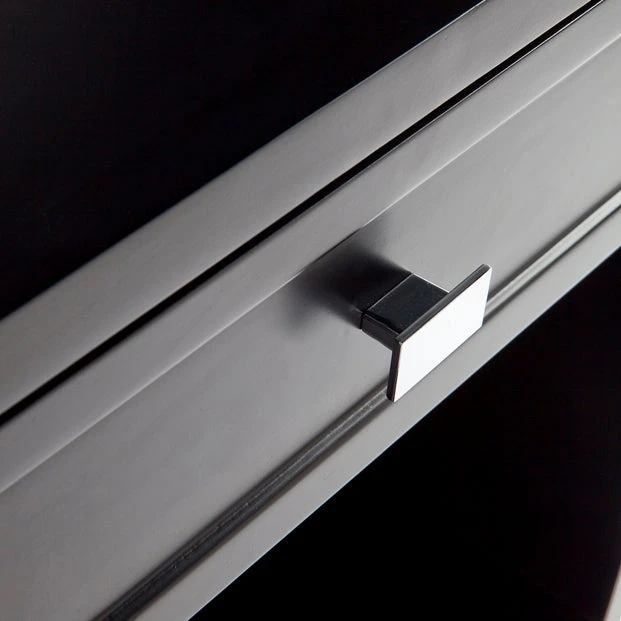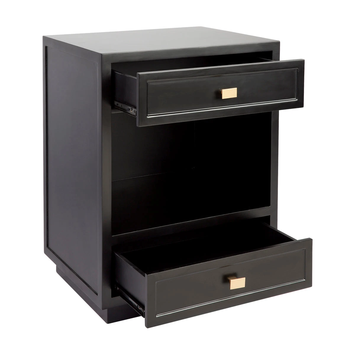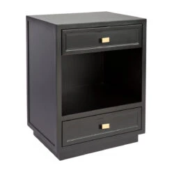 The Logan bedside table brings a refined and simple elegance to your space with a black satin finish and clean firm lines, tempered with subtle shaker panelling. A roomy nook between two drawers provides the perfect organisation solution. The timeless design of the Logan bedside table sits comfortably within a contemporary or classically styled environment offering true versatility with the option between brushed gold and polished nickel handles.