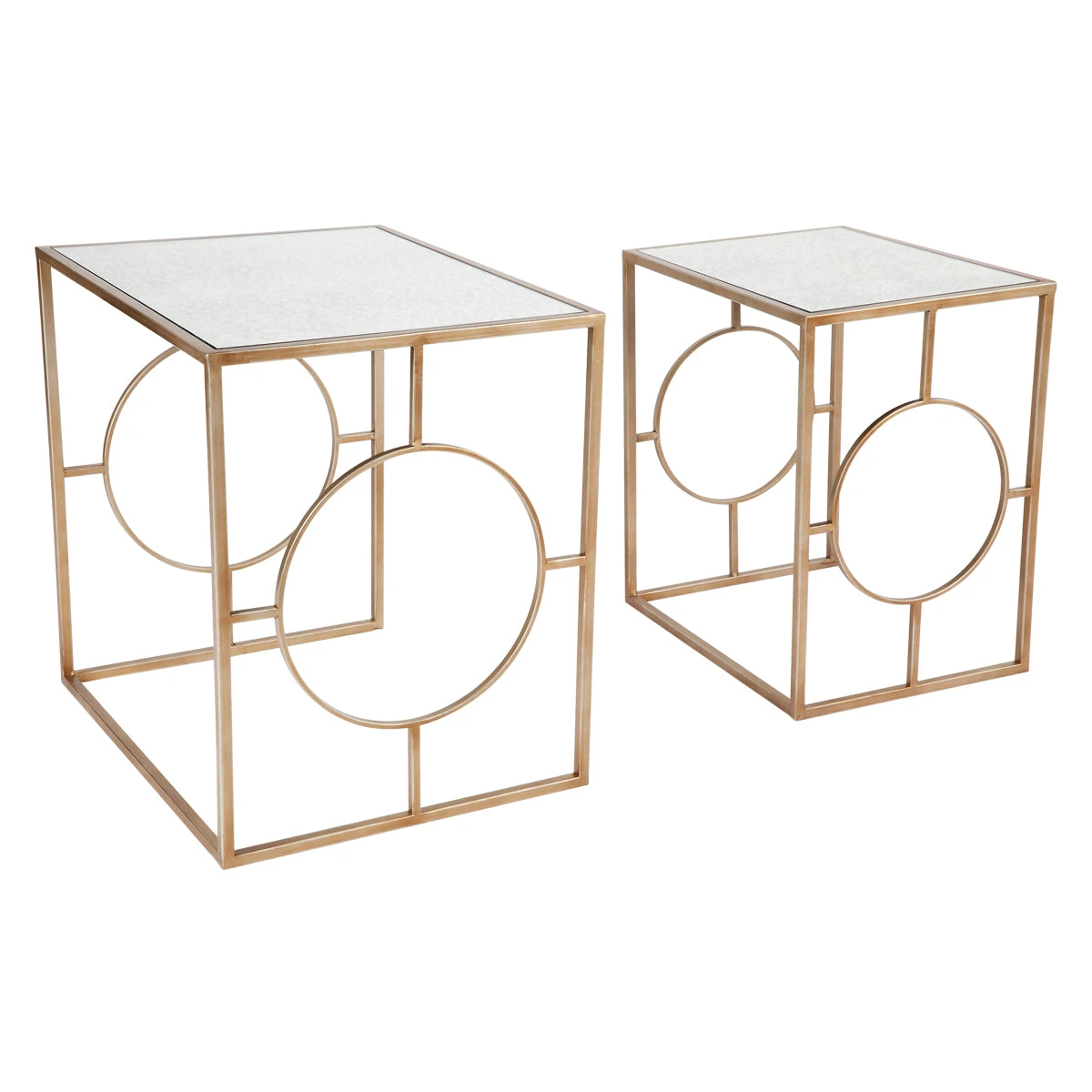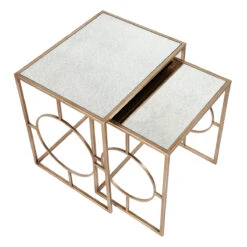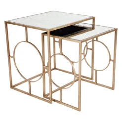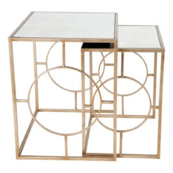 Antique gold iron frame, 2 piece nest of tables with antique mirror top and circle design sides. Colour finish variations may occur with each production