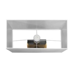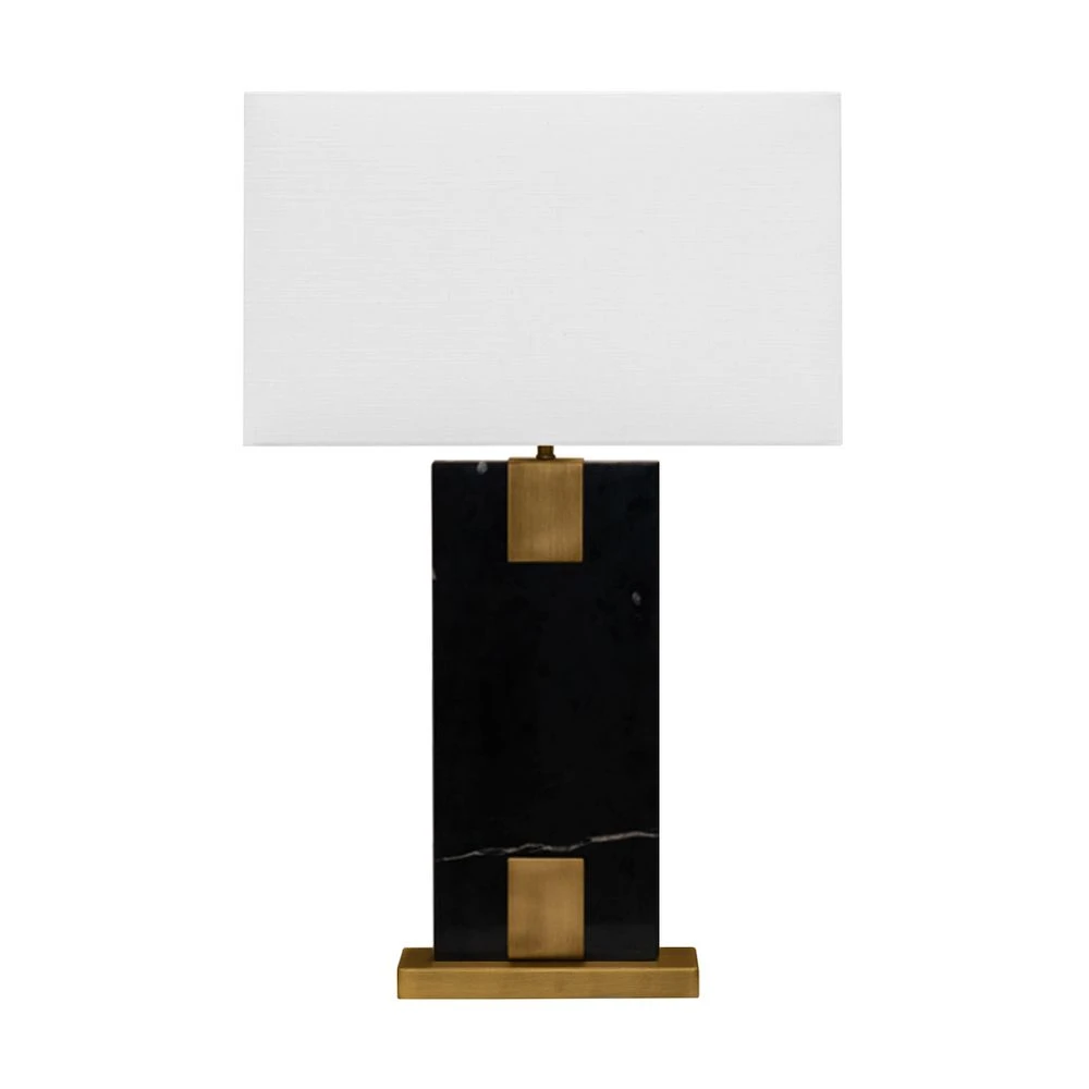 The Nazare table lamp enjoys a bold and streamlined silhouette where a stunning black marble panel is embraced by antique brass metal accents. Nazares white rectangular shade offers crisp contrast to its architecturally inspired base, creating an air of understated luxury.
