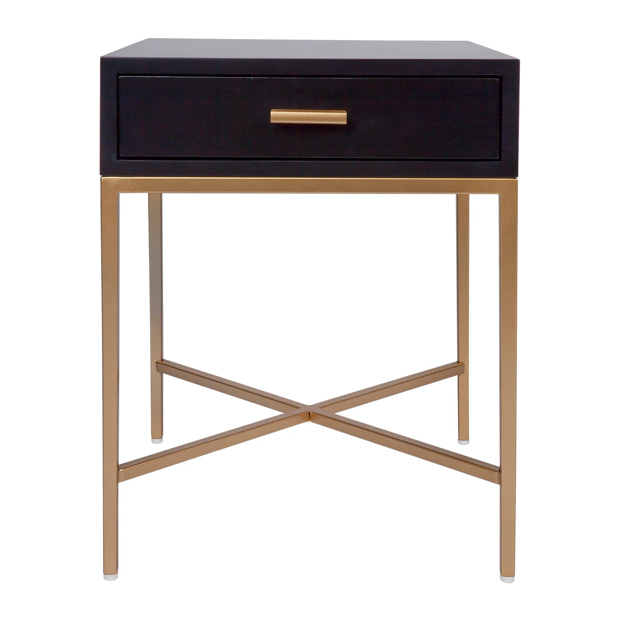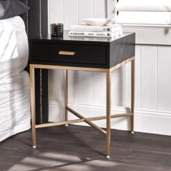 Sleek and refined, the Nessa bedside table is available in a playful myriad of finishes to suit your bedroom or living room. Featuring a lacquered rich black finish sitting atop a minimalist brushed gold tapered metal frame and coordinating drawer pull adds an element of charm to this petite single drawer bedside table.