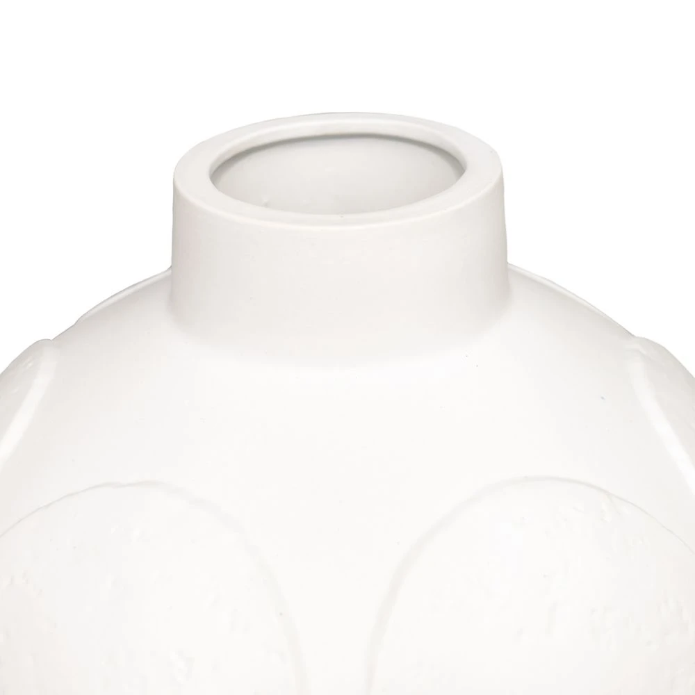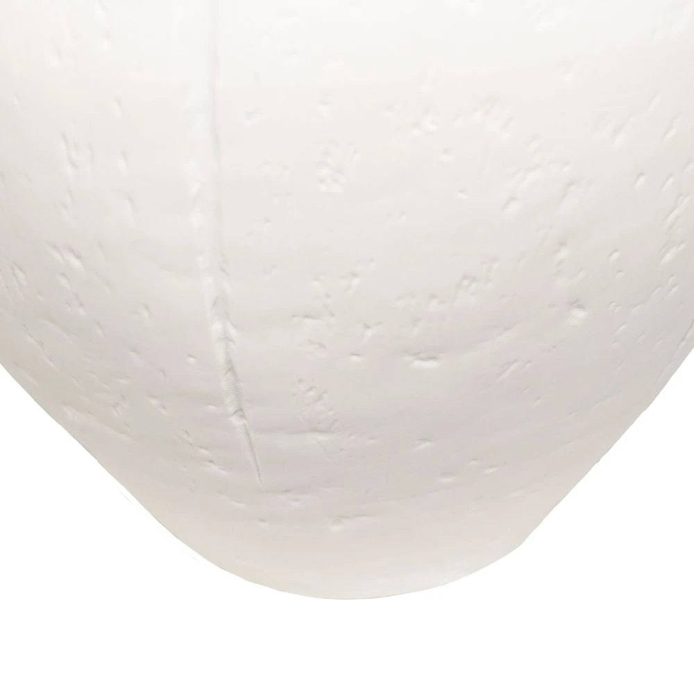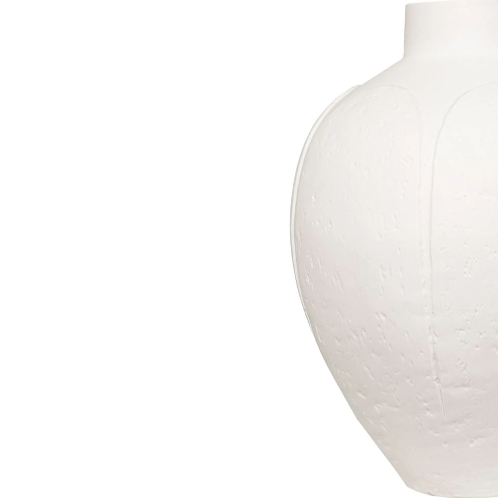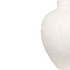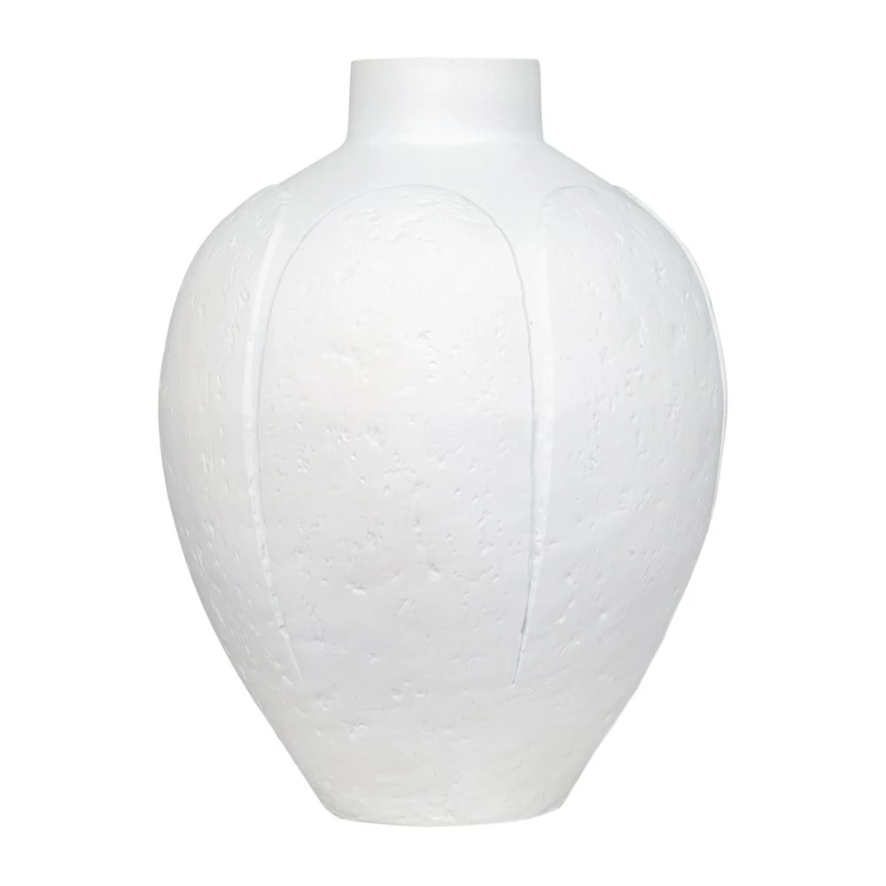 The Pandora Fan Vase – Medium is a stunning addition to any indoor or outdoor space. Its rounded curves and organic texture add a touch of fresh, sculptural style to any room. Made from off white ceramic with a matt plaster finish, this vase features a hand-crafted leaf pattern with a hatched linear detail that is both visually enticing and highly tactile. Available in two sizes, the medium Pandora vase measures 30cm in diameter and 40cm in height.
