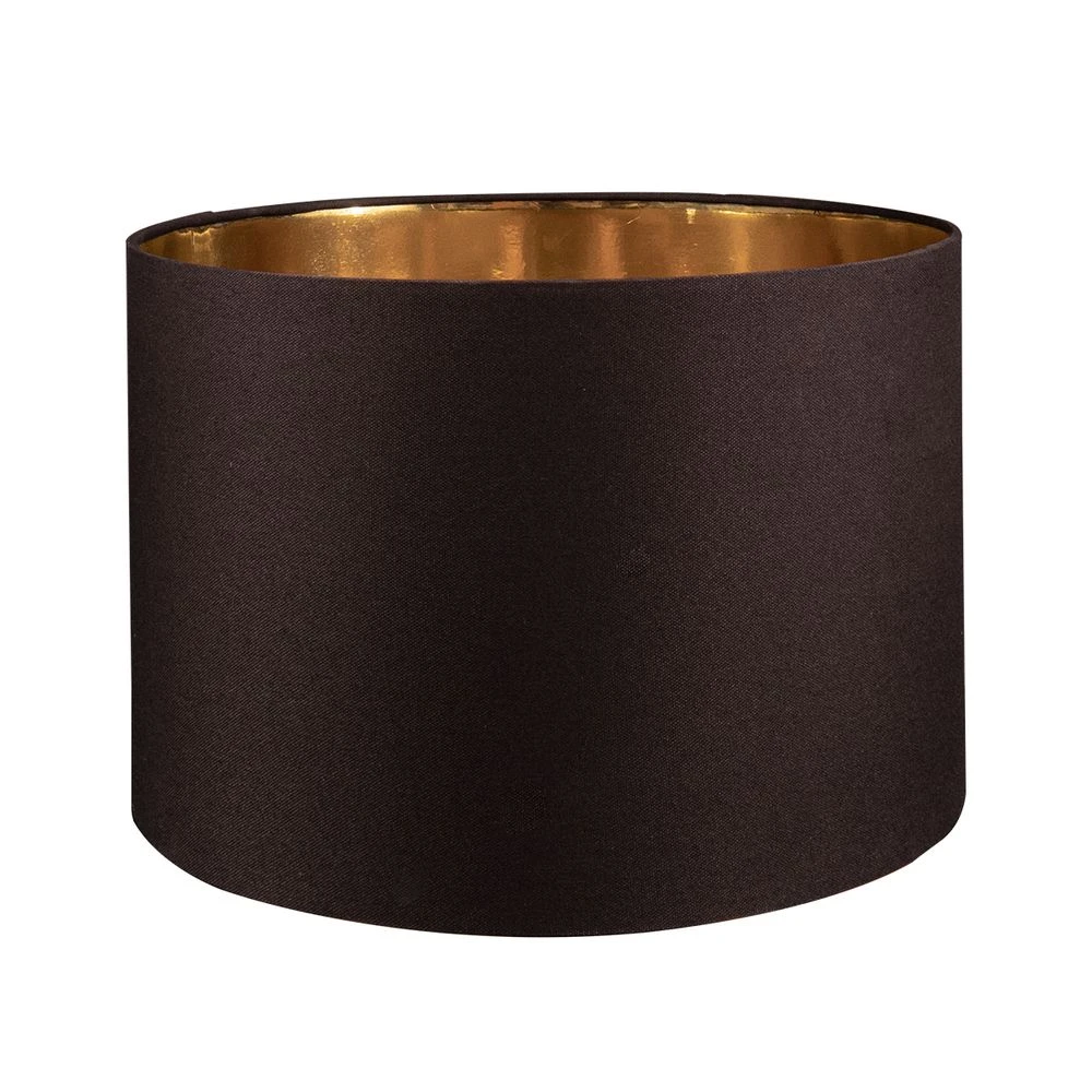 Black linen drum shade with rolled edge complimented with gold lining on the inside of the shade