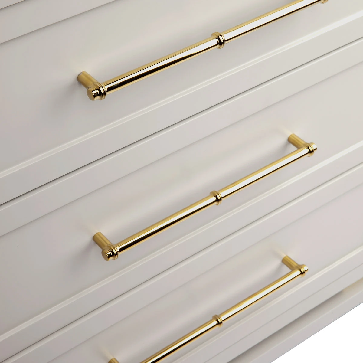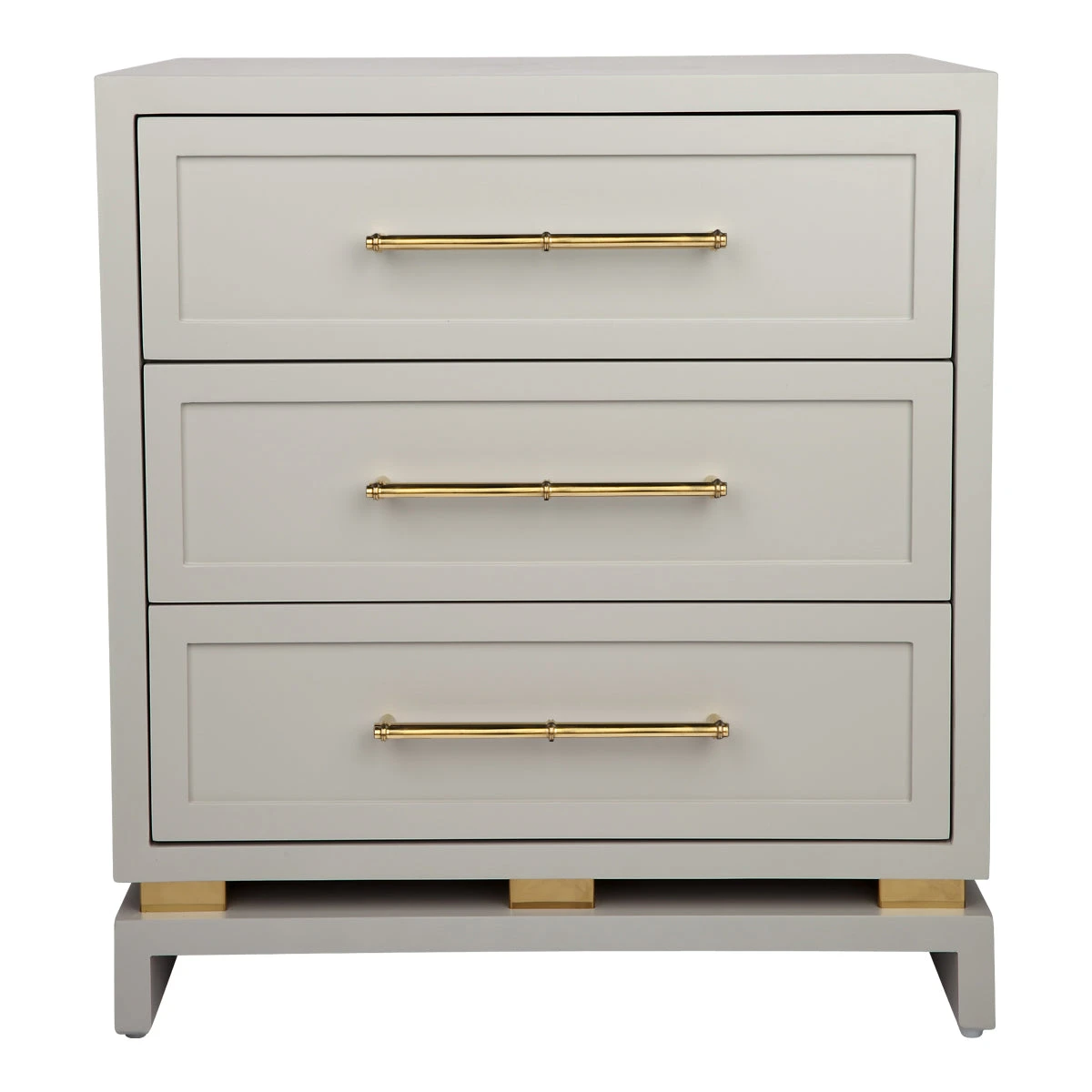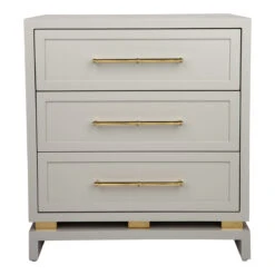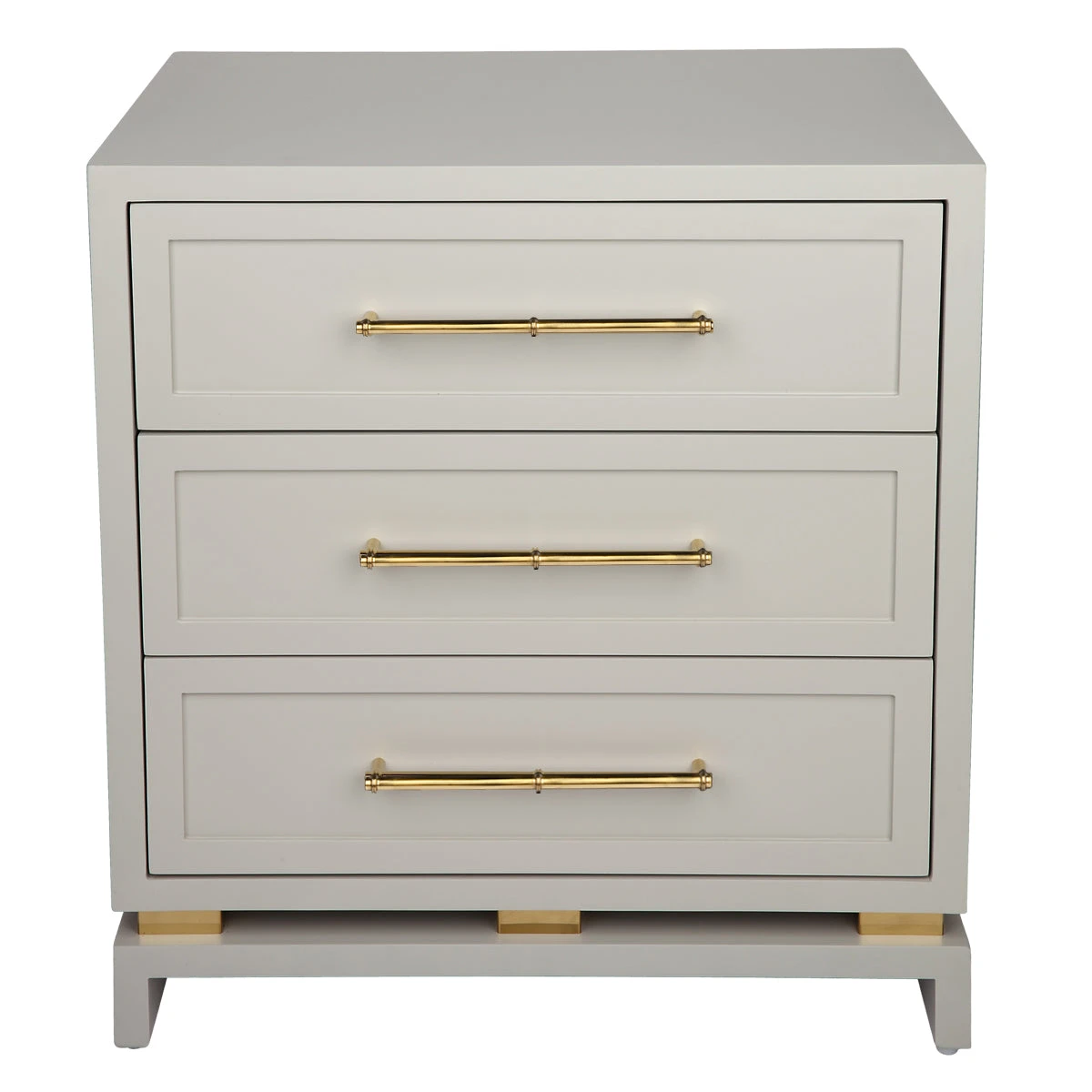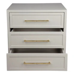 Timelessly elegant, the Pearl bedside table large complete with three drawers and removable top drawer dividers is the perfect organisation solution. A warm grey satin finish is complimented with stunning polished gold bamboo style handles. The ultimate bedroom luxury.
