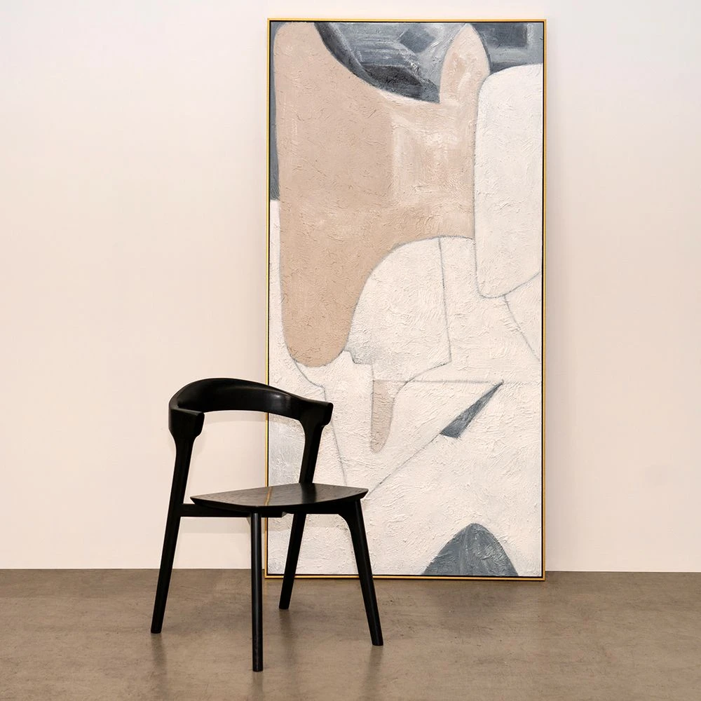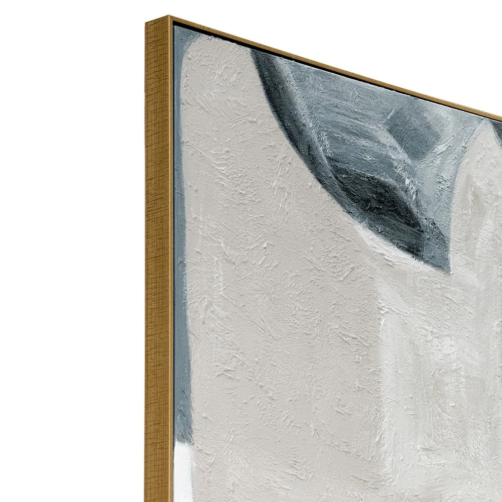 Introducing the Piece By Piece Oil On Canvas Painting, a stunning addition to any interior. This hand-painted masterpiece boasts neutral undertones with a touch of midnight blue and geometric grey line work, creating a delicate layering of tone and texture. Standing tall at 2 meters and framed in an antique gold shadow box, this contemporary piece is sure to refresh any space.