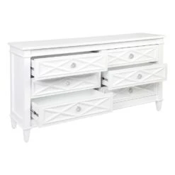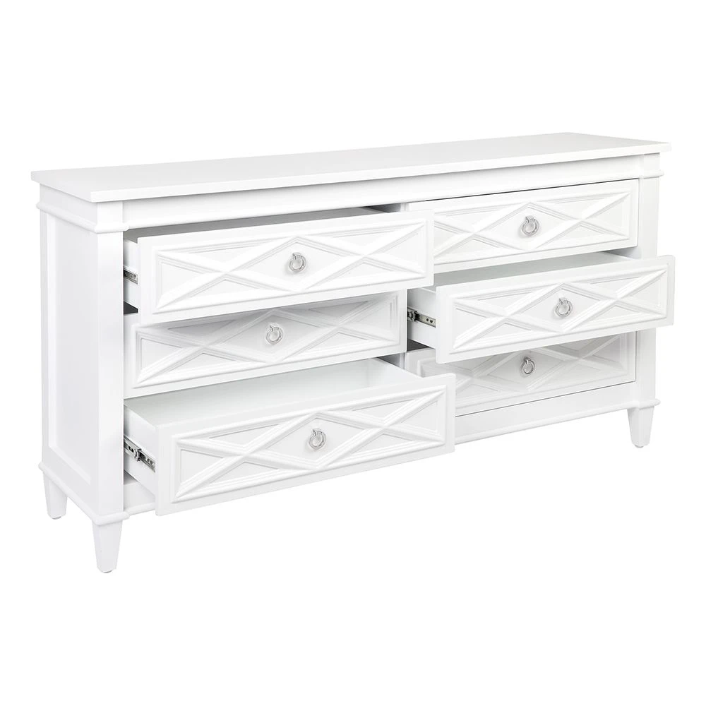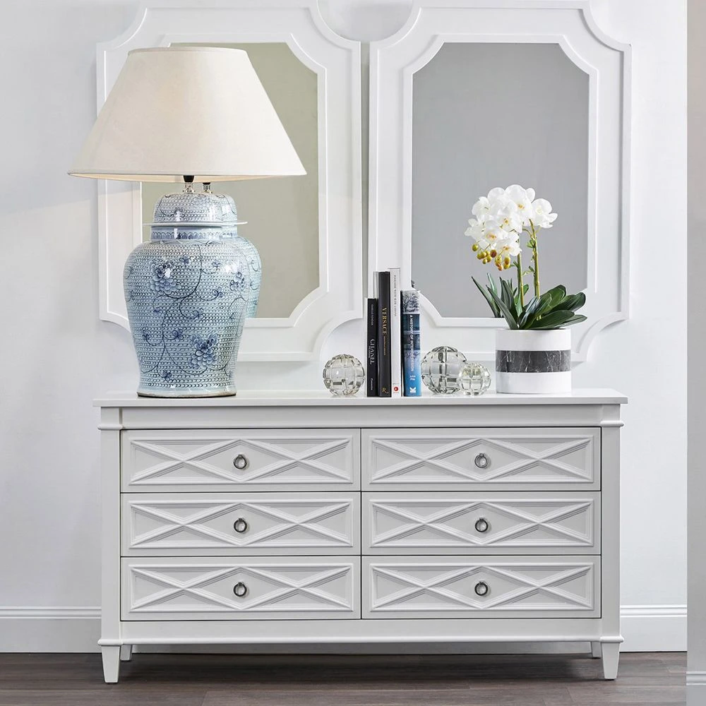 Perfect for a sophisticated coastal or refined Hamptons interior style, the Plantation range is one of our favourites at CAFE Lighting and Living, that incorporates all the classic elements into a functional and stylish design. A raised diamond pattern adorns the front of the Plantation six drawer chest, a crisp white satin finish complimented with polished silver handles enhances a simple neutral colour palette, whilst allowing you to maintain a crisp and open space.