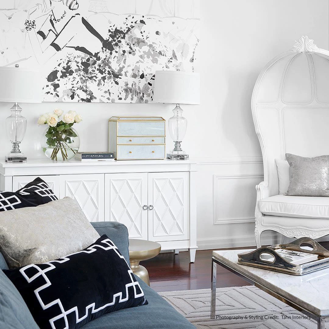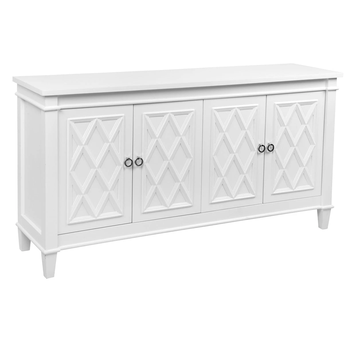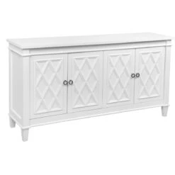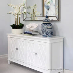 Introducing the Plantation Buffet in White, a must-have for any sophisticated coastal or refined Hamptons interior. This stunning piece from CAFE Lighting and Living incorporates classic elements into a functional and stylish design. The crisp white satin finish is complemented by polished silver handles, creating a simple and neutral color palette that will enhance any space.